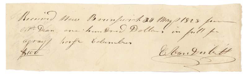 Steamship and railroad promoter; Capitalist. Founder f the family fortune which exists yet today, Vanderbilt stands as one of the greatest American capitalists in Amerian history. Autograph Receipt Signed, “C. Vanderbilt.” One page, 8” x 2 ½”. May 30, 1828. The receipt reads, in part: “Received … 30 May 1828 … one hundred dollars … in full … C. Vanderbilt.”