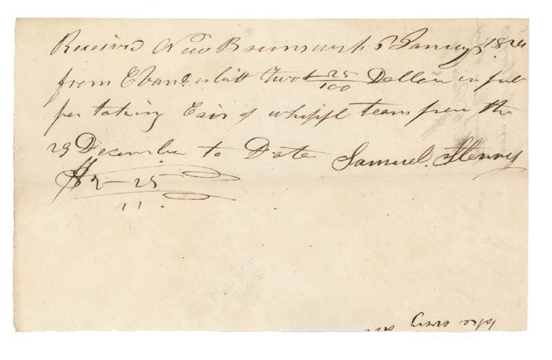 “Commodore” CORNELIUS VANDERBILT (1794-1877). Vanderbilt was a steamship and railroad promoter who founded the family fortune that exists to this day. He began at age sixteen as the owner-operator of a small ferryboat which ran between Staten Island and New York City. Autograph Document Internally Signed, “C. Vanderbilt.” One page, 7 3/4” x 4 3/4”. New Brunswick. January 5, 1824. The document acknowledges receipt of a payment from Vanderbilt. Docketing on verso. Fine.