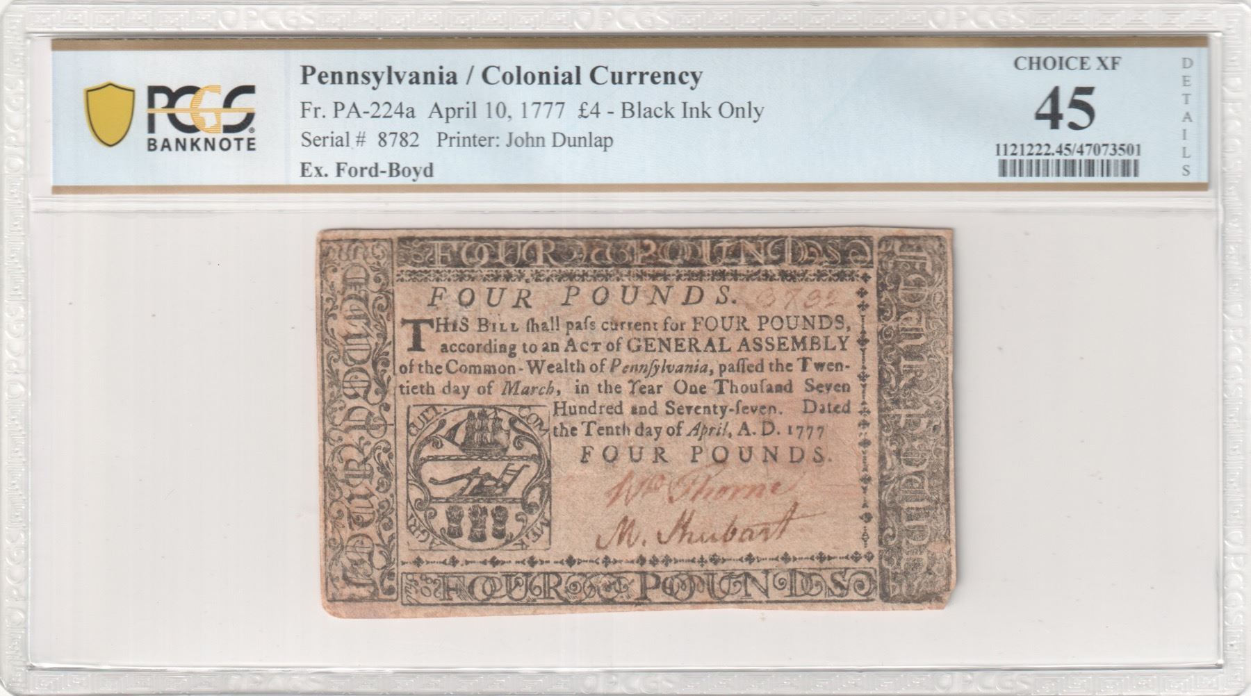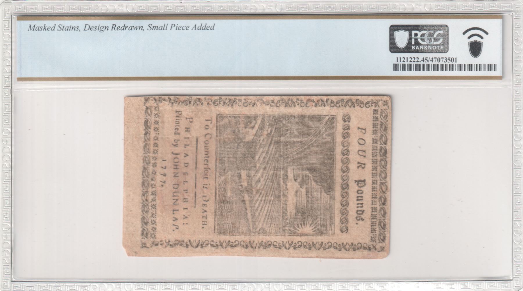 Common-Wealth of Pennsylvania. April 10, 1777. Four Pounds. Fr. PA-224a. PCGS Choice Extremely Fine-45 Details. Masked Stains, Design Redrawn, Small Piece Added. As illustrated.