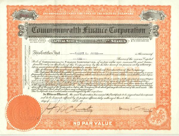 1921, Delaware. Stock certificate for 1 share. Orange/Black. Uncancelled and very fine.