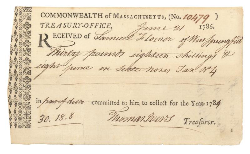 Treasury Office. June 21, 1786. “Received of Samuel Flower of West Springfield, thirty pounds eighteen shillings & eight pence on state notes tax No. 4 …committed to him to collect for the Year 1784”. Signed as Treasurer by Thomas Ivers.