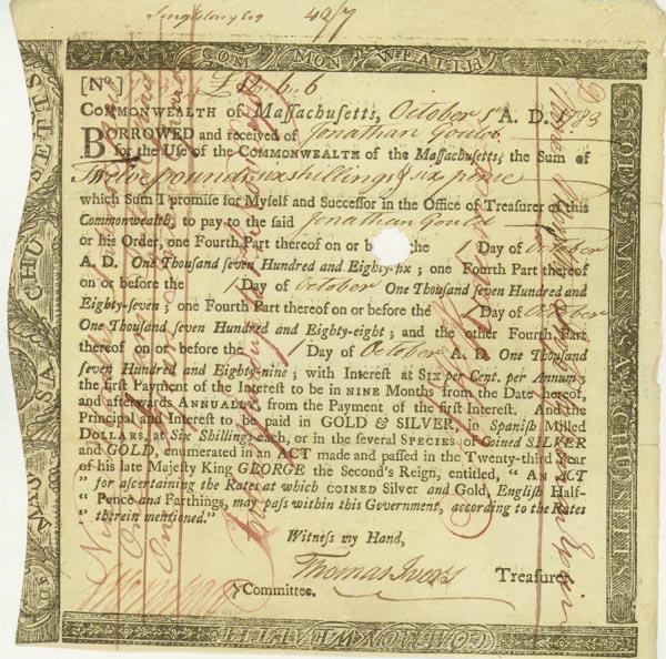 Anderson MA-34. Massachusetts. October 5, 1783. Partly-printed bond in which the state has "Borrowed and received of Johnathan Gould twelve pounds six shillings & six pence…to pay to said Jonathan Gould on fourth part thereof on the lst day of October…in GOLD and SILVER…" These were issued to for general borrowing purposes and the redemption of outstanding debt securities not promising to pay in gold or silver, or other commodities. Pen and punch cancelled. Extremely Fine.