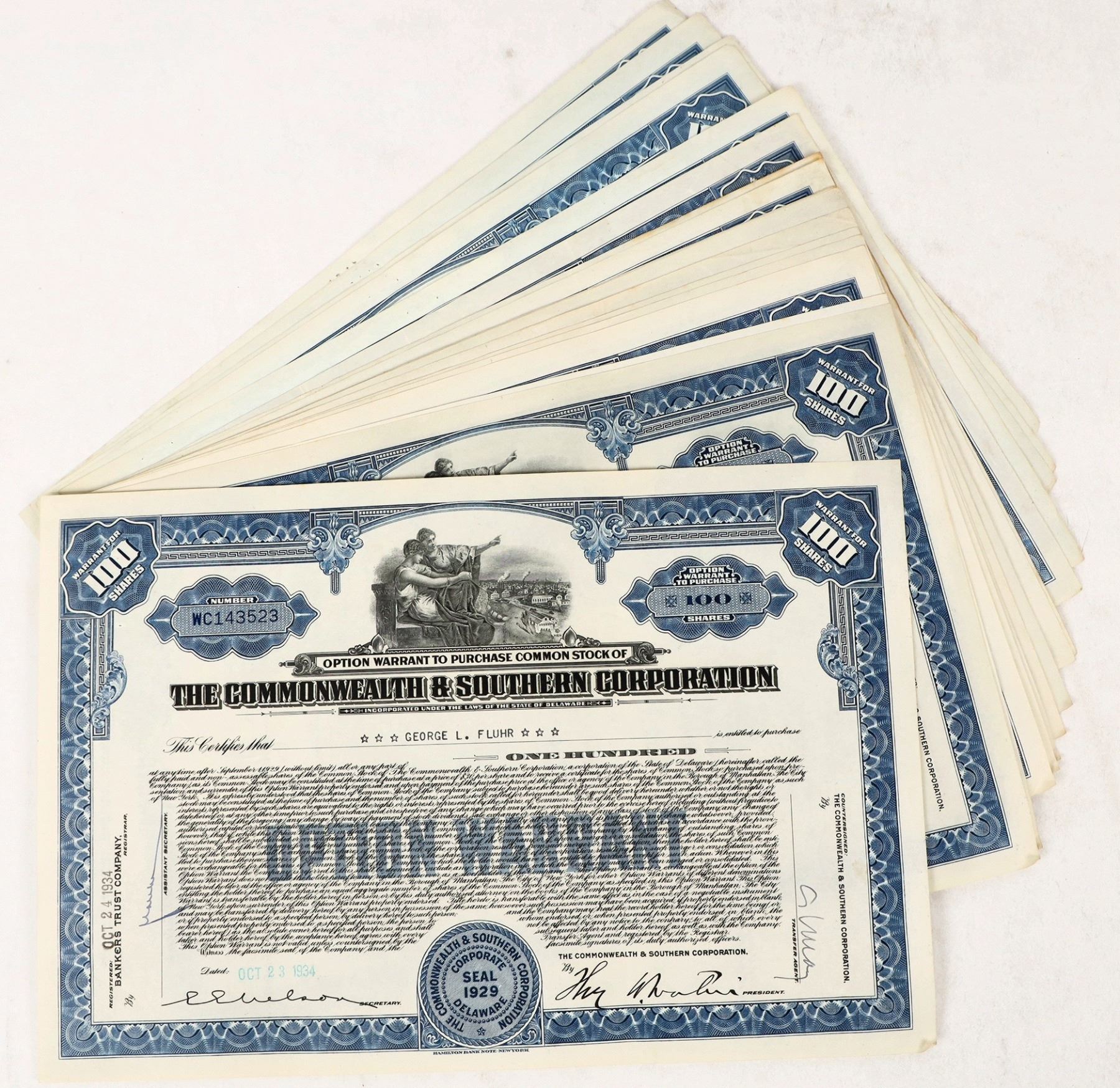 Group of 18 stock certificates from the Commonwealth & Southern Corporation, issued 1930 to 1941. All issued and uncancelled. Nice allegorical vignette. Lot is generally in great condition with a few more worn/discolored pieces; see photos.