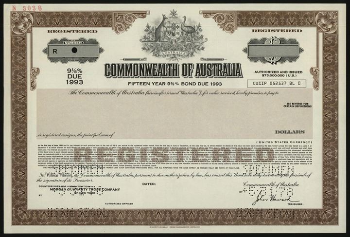 Australia.1978, $-Odd Specimen 9 1/8% Registered Bond, Black printing on brown border and undertint, Arms of Australia at top, Pin punched Specimen and Cancelled, Uncirculated condition, SC-USBNC.