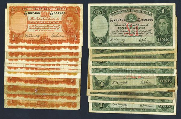 Australia. 10 Shillings, 1 Pound. SCWPM 25a (4); 25b (7); 26a; 26b (10). Very Good or so, some with tape or paper separation. 22 pieces.
