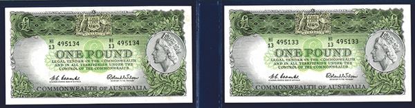 Australia, ND (1953-60), Both are sequential 1 Pound, P-30 (R33), Issued Banknote pair, Portrait of Queen Elizabeth II at right, Black on green underprint, S/N HI/13 495133 and 495134, Signature Coombs - Wilson, PMG graded Choice Uncirculated 64 and About Uncirculated 55. Attractive banknote pair.