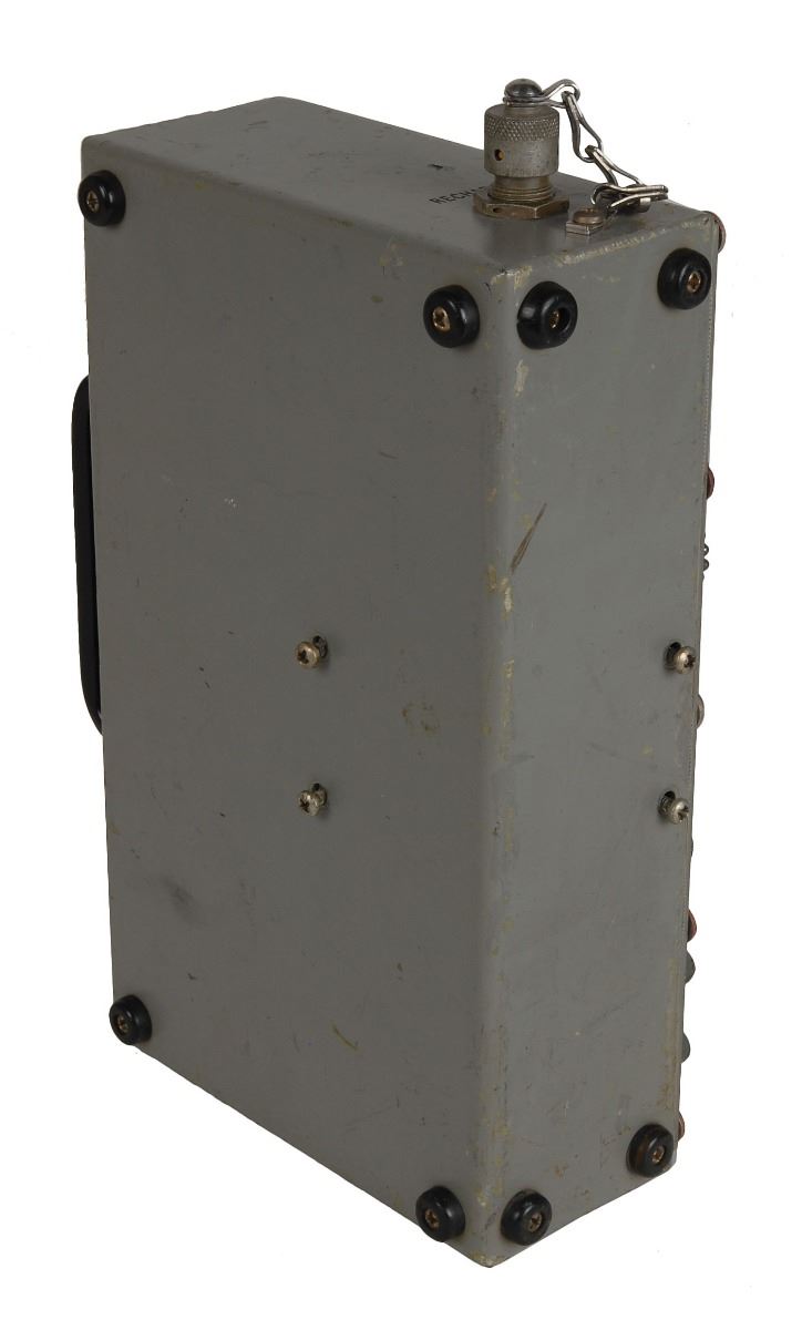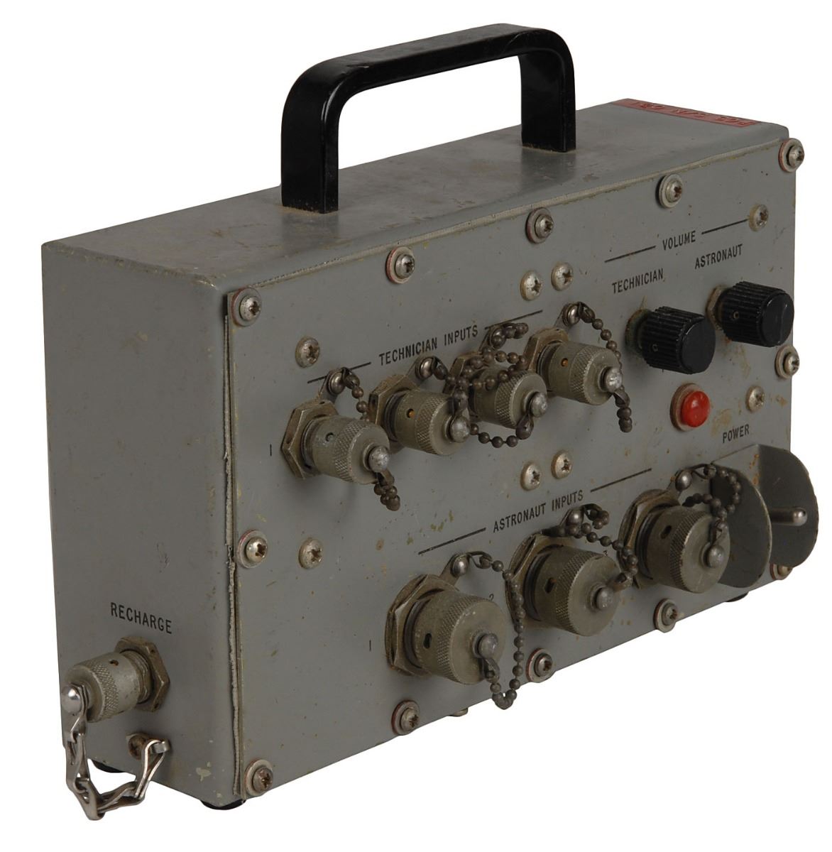 A GS7608 Portable Communications System made by the Hamilton Standard Division of United Aircraft Corporation, measuring 9.75 x 6 x 3, used to facilitate communication between technicians and astronauts during ground operations. The box features inputs for up to four technicians and three astronauts, as well as independent volume controls. Includes the original June 1967 operations manual for the unit, which further describes its purpose: “The PCS provides a means of two-way communications between a suited astronaut and his support technician. The system is to be used during the time interval between leaving the vehicle which transports the astronaut to the launch complex, and hookup to the spacecraft communications system. The system may also be used during tests with the astronaut suited in a normal environment.” In very good condition, with general wear.