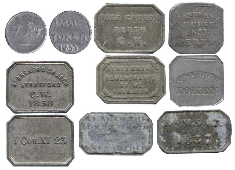 CW-296. New Annan and Leith. CW-310. Perth – Knox Church. CW-314. Perth – St. Andrew's Church. CW-324A. Ramsay, Almonte – St. Andrew's Church. CW-332. Stratford – St. Andrew's Church. Lot of five (5) tokens, all VF to EF or better.