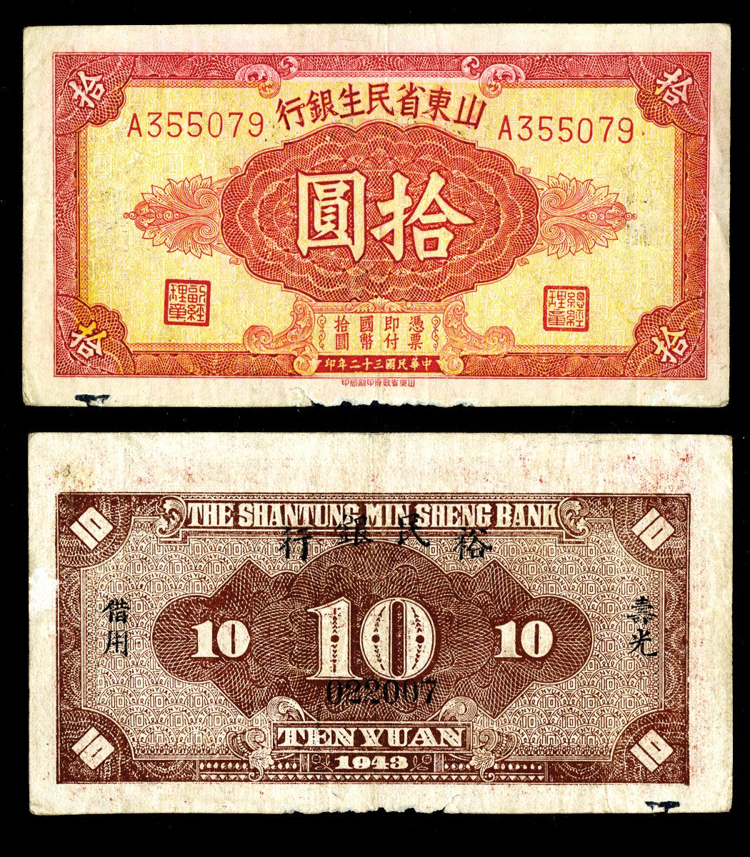 China, ND (old date 1943), The base note, 10 Yuan, P-S2744 is overprinted on the back "Yu Min Hang". The listing was dropped from the SCWPM along with illustrations. The note is still referred to as P-S3785 in the SCWPM and is an extremely rare Communist issue. Choice Fine to VF with a rough lower margin, otherwise a very collectible example of this rare note.