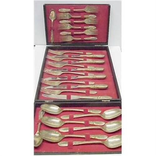 Gorgeous antique set of serving cutlery - flatware, Made by Community silver plate in lovely ornate style,WHITE ORCHID, It is exquisite! The set consists of 30 pieces:6 dinner forks, 6 soup spoons,6 dinner knives, 6 pie forks and 6 coffee spoons. All in all 30 pieces and it comes in original box, which is lined with red color felt,The silver comes in excellent used but not abused condition.US Buyer please pay 24.00 for shipping it is very heavy.Thanks for looking!