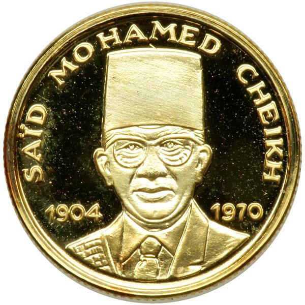 Comoros. 10,000 Francs, 1976. Fr-2; KM-11. Weight 0.0888 ounce. Mintage 500. Bust of Said Mohammed Cheikh. Reverse: Colibri hummingbird. Brilliant Proof.
