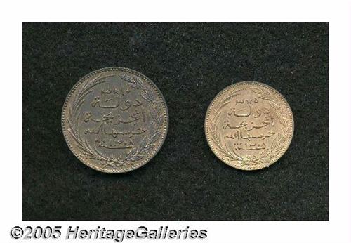 <B>French Protectorate 5 & 10 Centimes 1308AH (1890), </B></I>KM1.1 Privy mark = Fasces, nice UNC with nearly full luster and KM2.1 Privy Mark = Fasces, nice UNC with considerable reflective luster. A nice pair from this tiny group of islands near Madagascar.