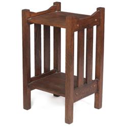 Compact Furniture Co. magazine stand, two shelves with two vertical slats on each side, original finish, 16”w x 15”d x 28”h, very good condition
