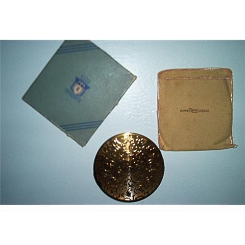 Excellent condition with "Glove" designed cover along with the original box. Gold Plated compact, still inside of a soft yellow-gold, soft cloth, with "FIFTH REX AVENUE" imprinted on the cloth. Art Deco designed compact. Gold Plated. Measures 4 inches in diameter. Still inside the compact is the powder puff and strainer for the powder. This compact was never used. The mirrow is still intact, but shows some aging. The art deco, gold plated outside designs are on both the top and bottom of the outside. Pink powder puff and liner still inside. Estate Find. Mint Condition. This is a great compact that would look great to display on your vanity or a dresser or still could be used for yourself.