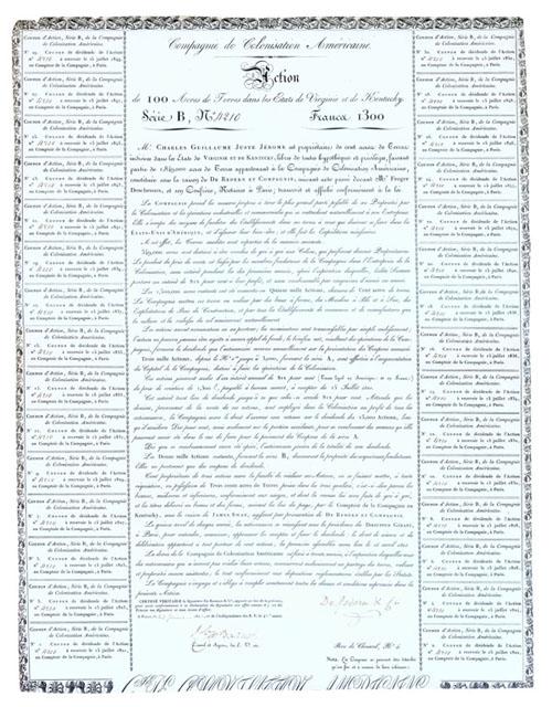 1820, Paris, France. French language stock certificate for one share at 1300 Francs issued for 100 acres. A large certificate measuring 13 3/4” x 18”. During the early 19th century, a large number of European investor came to America in the hopes of buying land for development and promotion to potential European immigrants. This French company was one such attempt, with ownership of over a million and a half acres in Virginia and Kentucky. A fine, early certificate related to the European development of America. A few tiny holes. Uncancelled and Excellent.