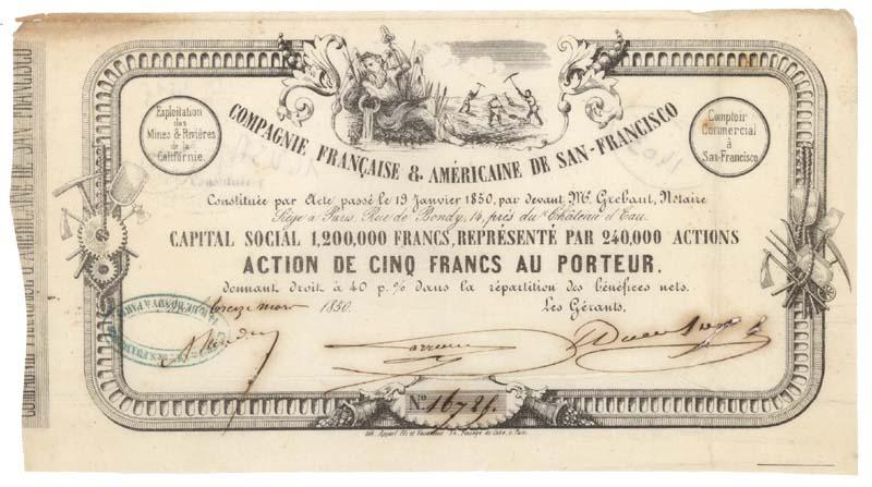 California & France. Bearer bond for 5 francs. Black. Outstandingly attractive small-format certificate with an ornate border containing mining tools at left and right, and a vignette at top center depicting a reclining allegorical male figure in front of miners digging in a field. Headquartered in San Francisco, this was an exceptionally early attempt by the French to participate in and profit from the California gold rush. Scattered light aging. Some minor ink errosion at signature. Very desirable and fine.