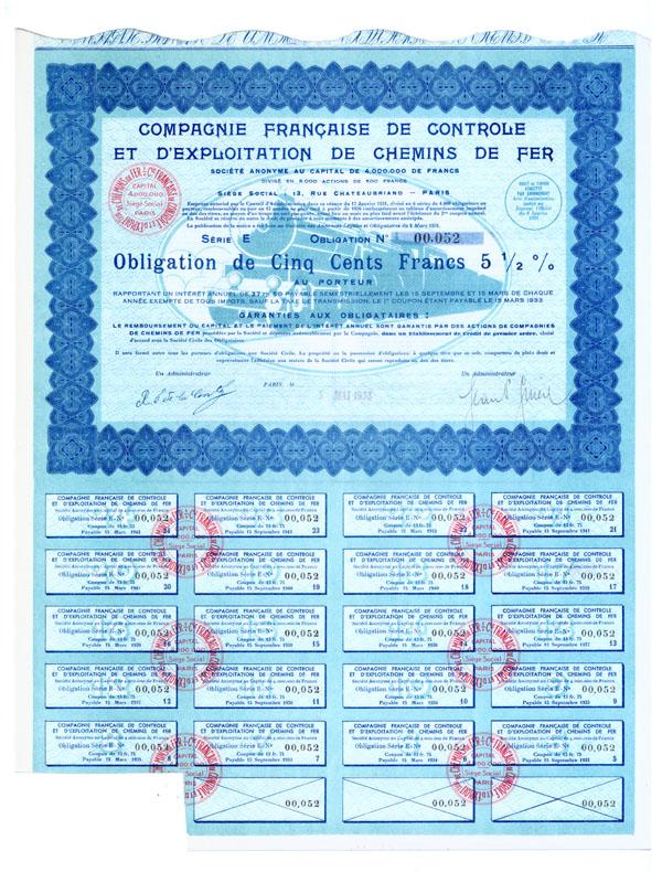1933, Paris, France. 500 franc bond bearing interest at 5 1/2%. Blue. Vignette of a silhouette of a steam locomotive at center. Litho .Coupons below. Uncancelled and choice.