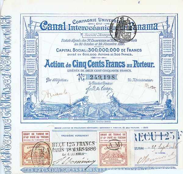 1880, France. Stock certificate. Blue. Vignette of allegorical figures at bottom center.