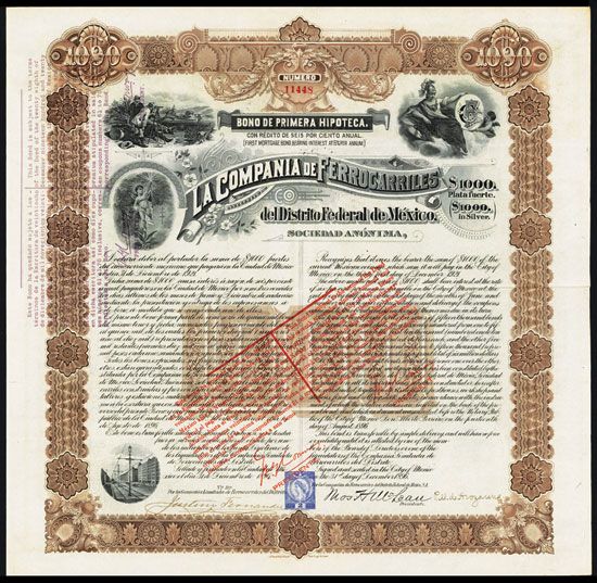 Mexico, 1896, $1000, 6% 1st Mortgage Bond, Black on light brown border and underprint, Small vignette bottom left of electric tram line surveyors top left with flying cherub holding electrical lines below and allegorical woman top right holding company logo, VF condition, August Gast & Co. Bank Note Engravers St. Louis.