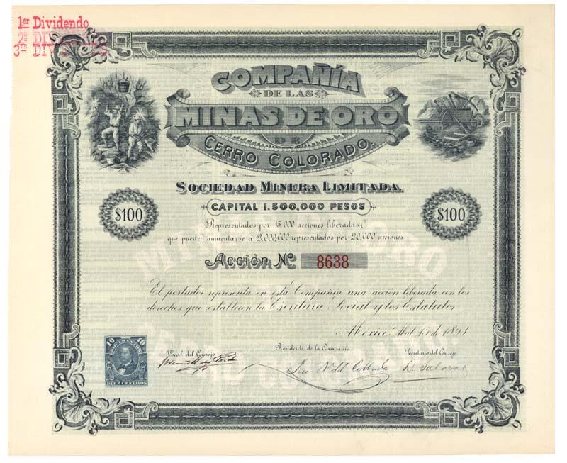 1893, Cerro, Colorado. Stock certificate for $100. Vignette of miners at work in upper left, mining equipment at right. Litho. A nice, imprinted Mexican revenue stamp at lower left. Uncancelled and Extremely Fine.