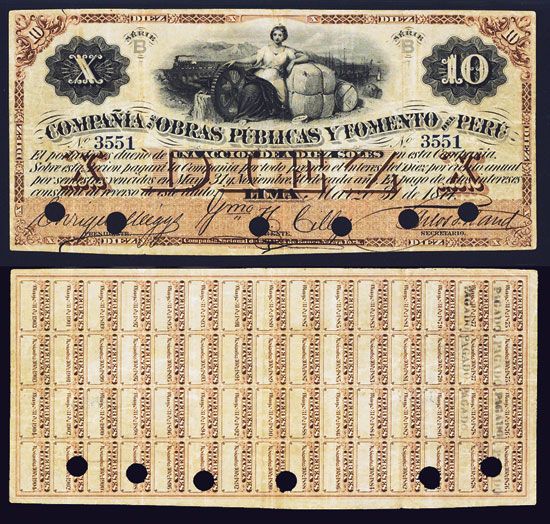 Lima, Peru, March 31, 1874, 10 Soles, Serie B, P-Unlisted, Issued and cancelled, Black on brown underprint, Reclining allegorical woman on bales on barrels with train and ships in background, back with small 60 interest coupons, 7 with ÒPagadoÓ overprinted on them, 7 x 3 1/8 inches, POC's at signature blocks, S/N 3551, PMG graded Very Fine 25, Rare if not unique Interest Bearing banknote. Listed in middle as ÒUna Accion de a Diaz SolesÓ. PMG gave this the catalog designation ÒPick# SUNL 10aÓ, NBNC. A trophy note for the Peru specialist and very possibly the only opportunity to purchase it. First time offered publicly.