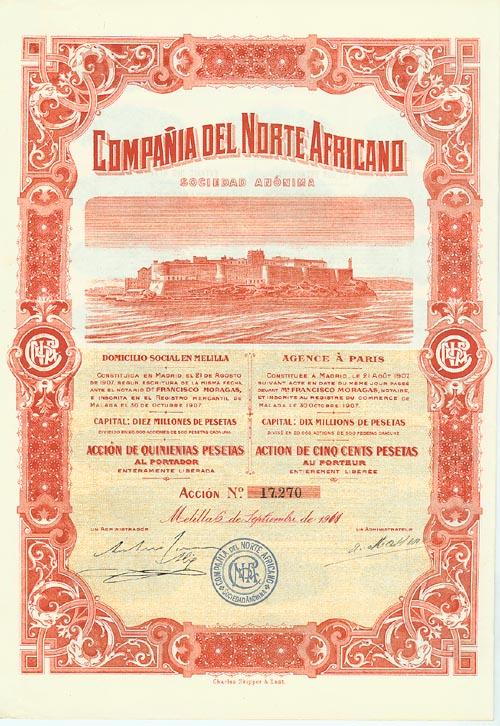 1907, Spain. Stock certificate. Orange. A nice, detailed large vignette of fortress at top center. Coupons at right. Printed in Spanish and French. Uncancelled and Fine.