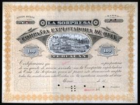Tehuacan, Mexico, 18xx (ca.1880's). "La Sopresa". 100 Pesos, Orange-yellow border and underprint with locomotive and mining camp and ornate title, Specimen overprint and POC. Back has long text in Spanish relating to the bond. VF condition with light toning on top. Rare Mexico Specimen bond. From a new find of Hamilton BNC specimens and proofs. HBNC.