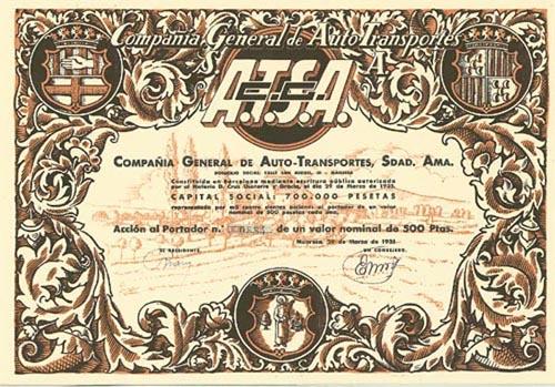 1935, Spain. Stock certificate. Brown/Black on tan paper. Very ornate border with seal at bottom center. Uncancelled and Extremely Fine.