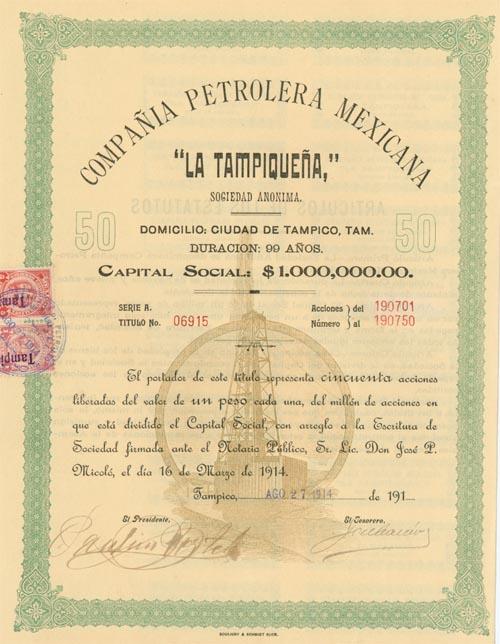 1914, Mexico. Stock certificate. Green/Black.