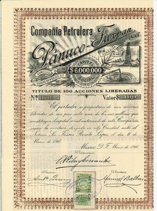 1916, Mexico. Stock certificate. Brown/Black. Vignette at top center. Very fine.
