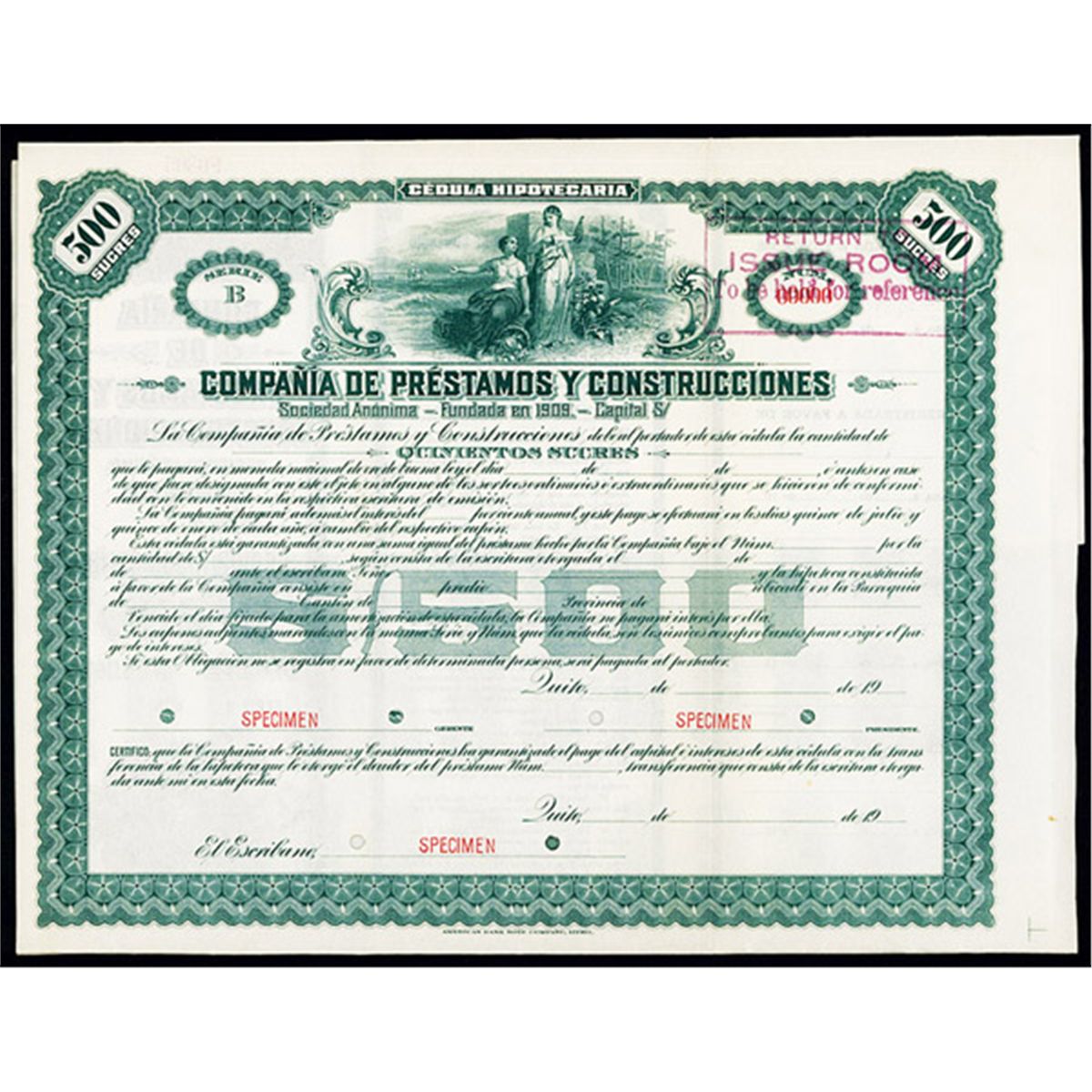 Quito, Ecuador. 19-- (ca.1900-30). 500 Sucres, green, Allegorical women with oceans and forests. Red SPECIMEN overprints and POC's. Coupons attached. VF-XF Condition. ABNC.
