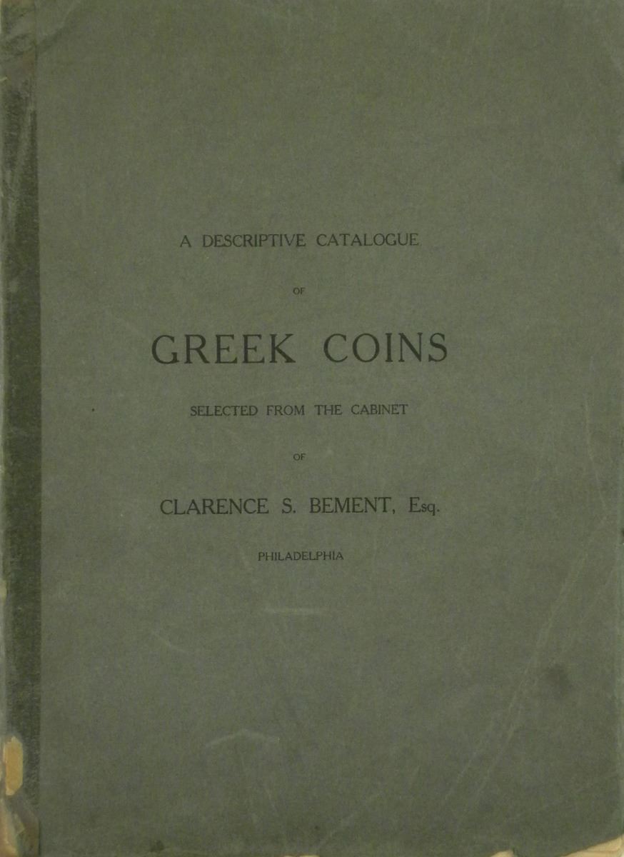 Comparette, T.L. A DESCRIPTIVE CATALOGUE OF GREEK COINS SELECTED FROM THE CABINET OF CLARENCE S. BEMENT, ESQ. First edition. New York: ANS, 1921. 4to, original printed card covers. (4), 106, (2) pages; 25 plates of coins. Card covered spine worn, with some chipping to covers. Would benefit from binding; contents very good or better. Ex Cornell College Library, with their stamps and spine label. A very scarce catalogue, being a detailed work, written by Thomas Louis Comparette, of "370 specimens ... that are either very rare or at least not very abundant. Among the latter will be found some that have been included because of their exceedingly fine state of preservation, being often rare in that important respect." Clain-Stefanelli 1922. Daehn 2037.