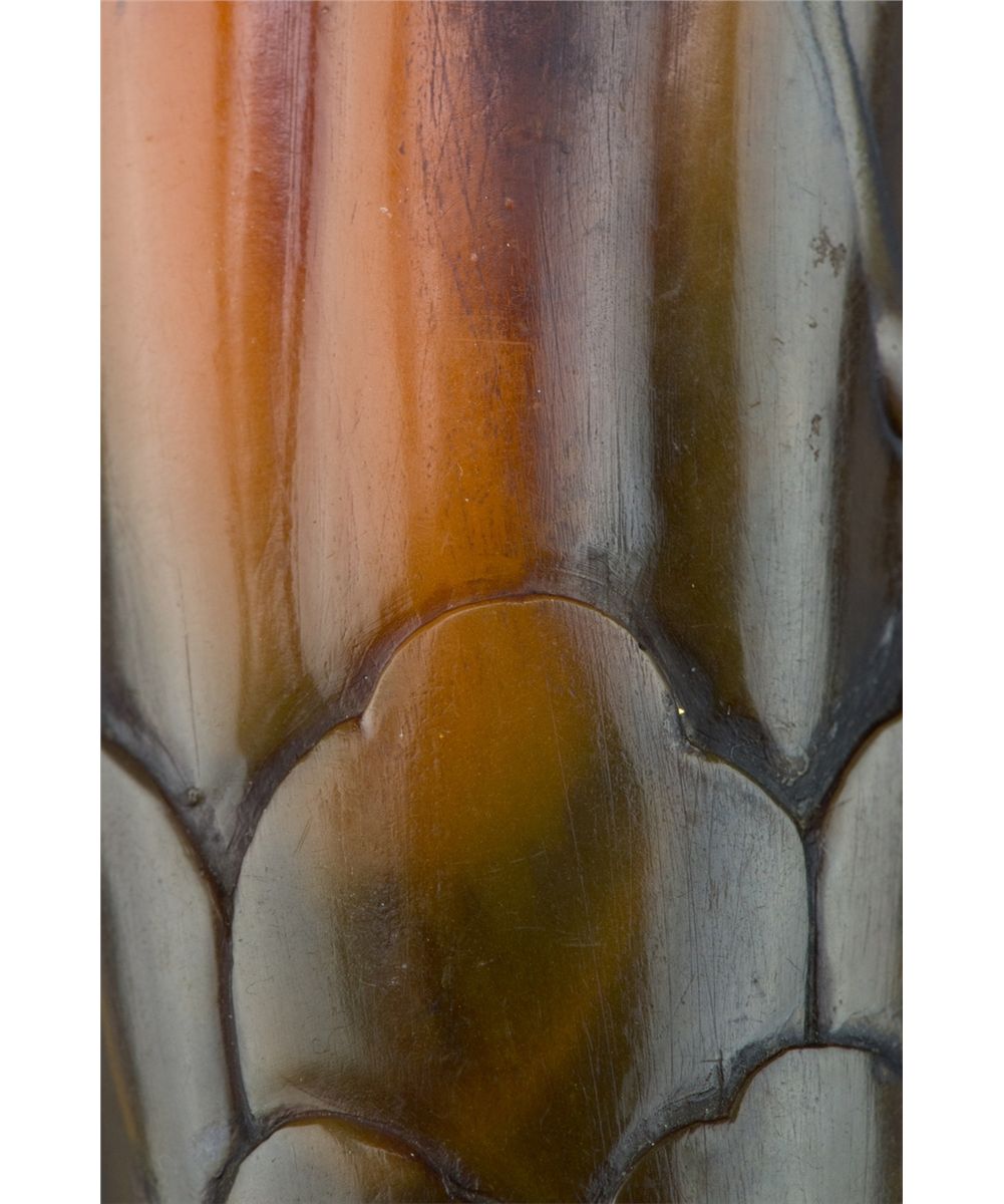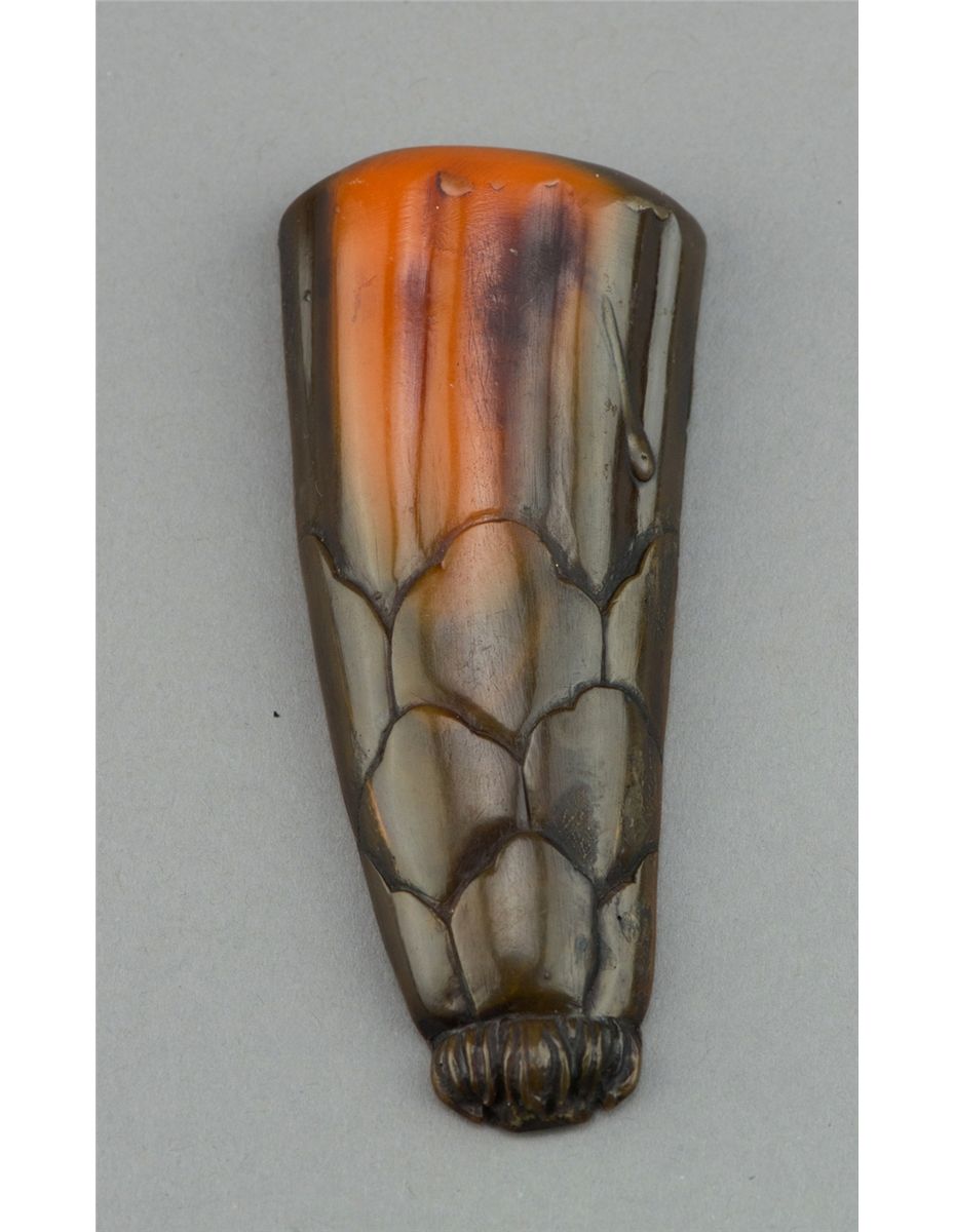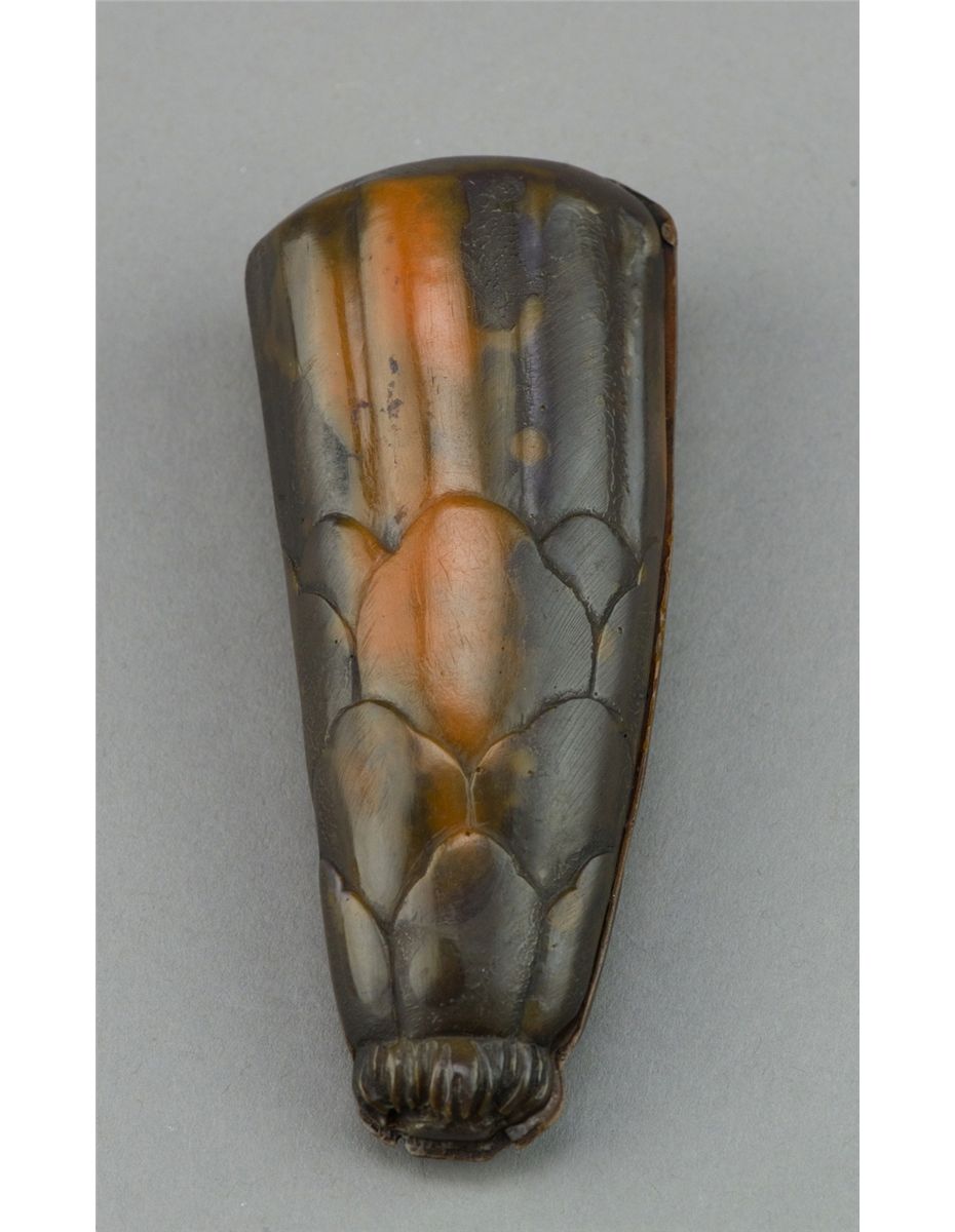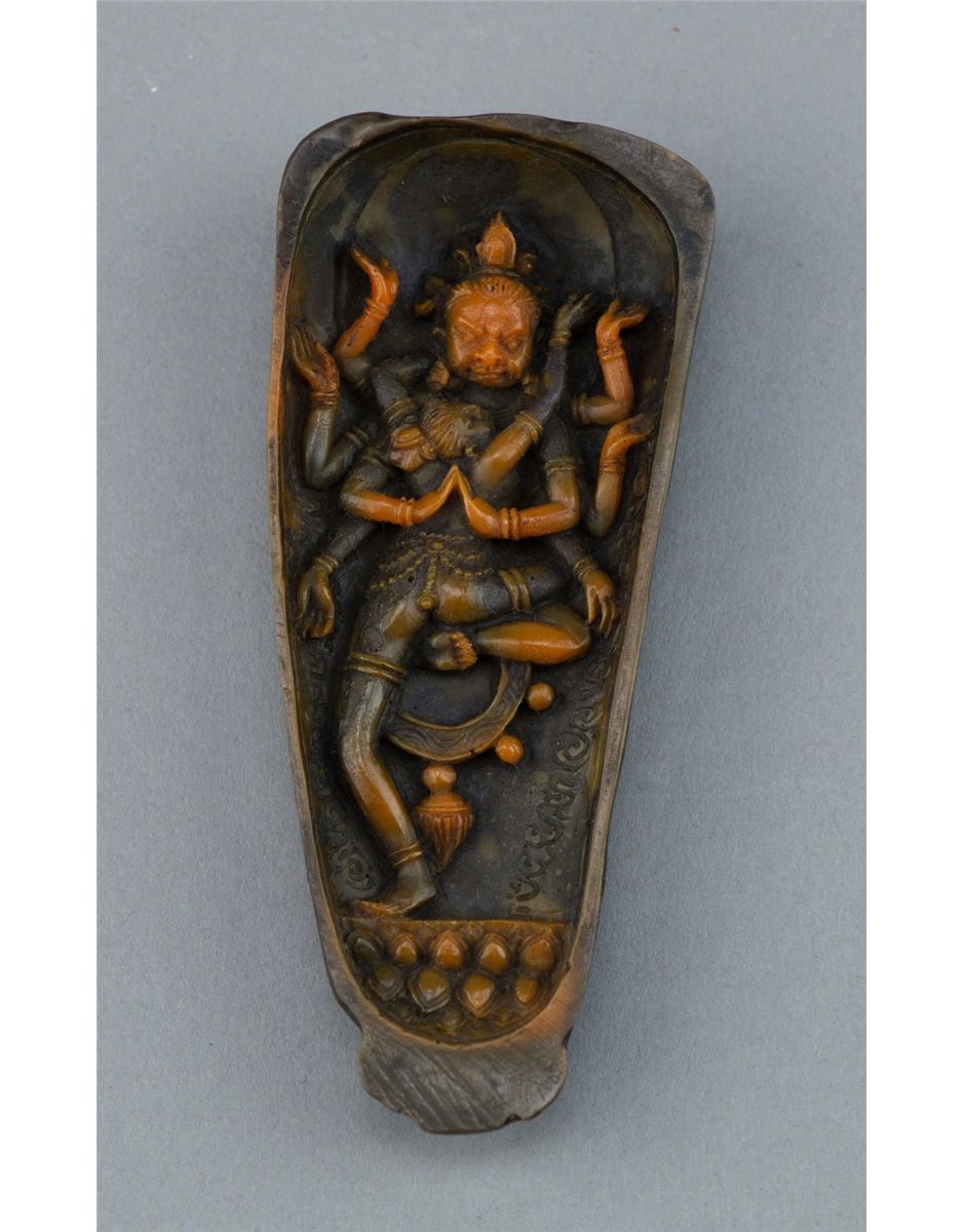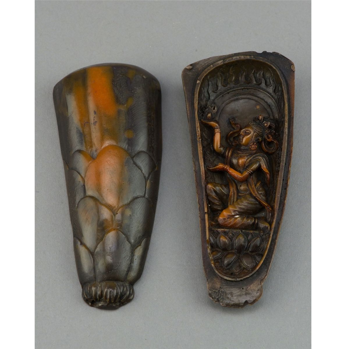 Chinese horn separated into halves with carving of Kwanyin on the inside. H: 12 cm, W: 5 cm, 111 grams.