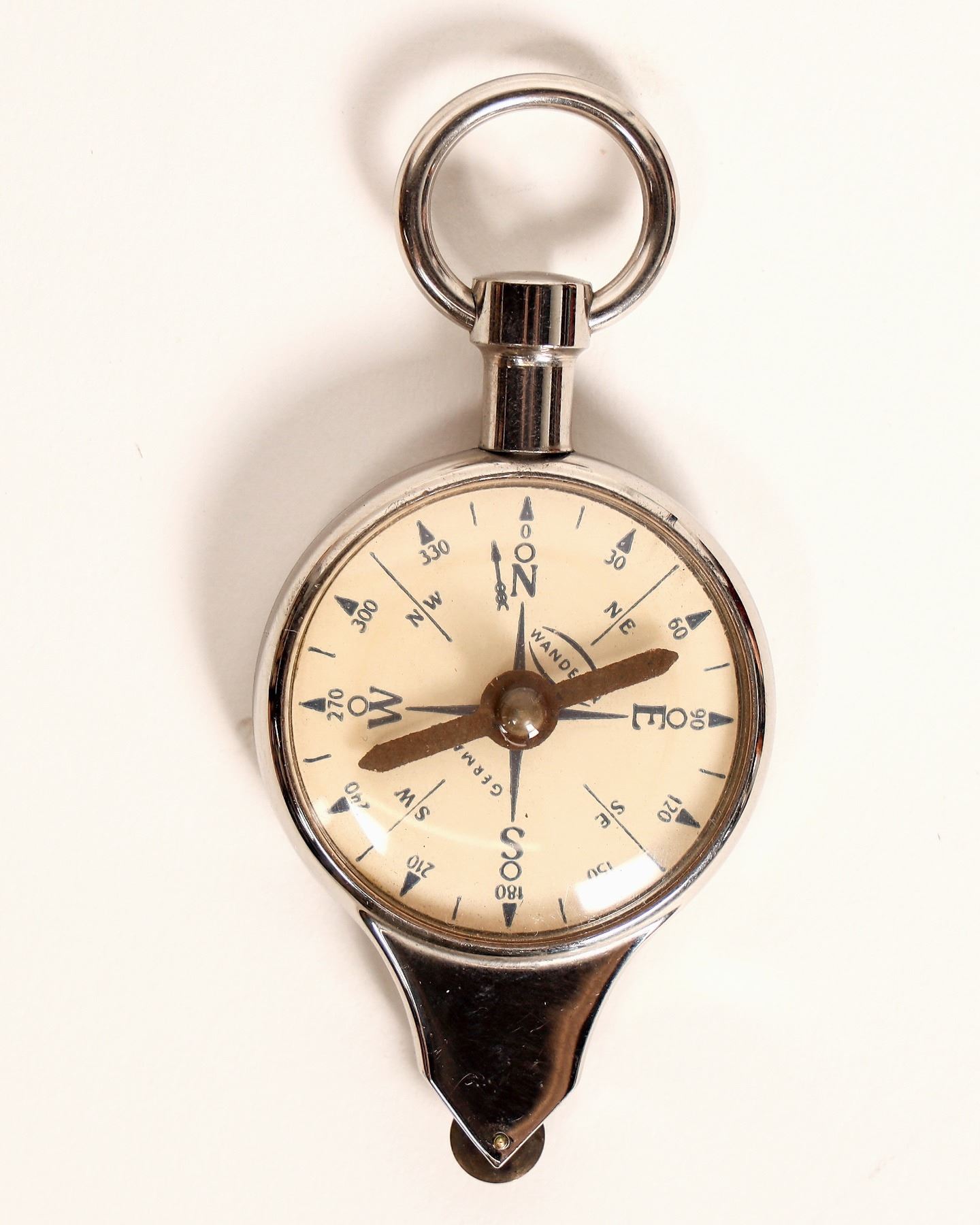 This unique compass is made in Germany with a compass on one face and the reverse face has a wheel drive to calculate distances from a map. C. 1930's. Cleverly designed with fast acting readings. The map reading is in land miles and nautical miles. 1. 375 in. face with carry case and instructions. Please see photo for details. Marked "made in Germany" without any prefix. c.1930's.
