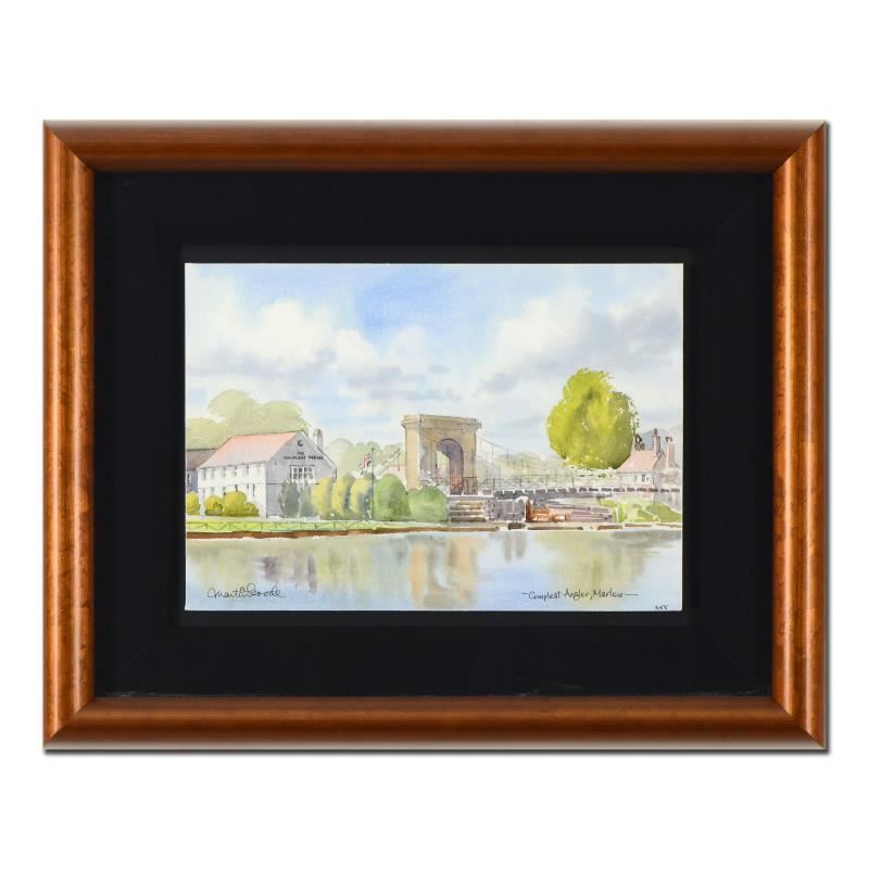 "Compleat Angler, Marlow" is an original watercolor painting on paper by Martin Goode (1932-2002), hand signed by the artist. This piece comes custom framed. Includes Certificate of Authenticity. Measures approx. 18" x 14.5" (frame), 11.5" x 8" (image).
