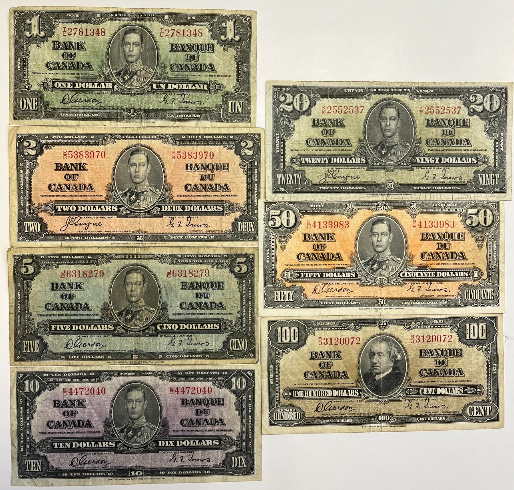 Complete 1937 set; includes $1, $2, $5, $10, $20, $50, $100, all 7 notes F-VF or better