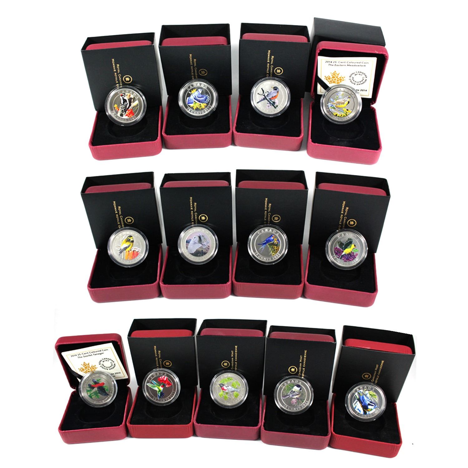 Complete 2007-2014 Birds of Canada 25-cent Cupronickel Coin Set of 13 coins. You will receive 2007 ruby-throated hummingbird, 2007 red-breasted nuthatch, 2008 downy woodpecker,2010 goldfinch, 2010 blue jay, 2011 barn swallow, 2011 black-capped chickadee, 2012 evening grosbeak, 2012 rose-breasted grosbeak, 2013 American robin, 2013 barn owl, 2014 eastern meadowlark & 2014 scarlet tanager (2007 ruby-throated hummingbird coin lightly scratched). 13pcs