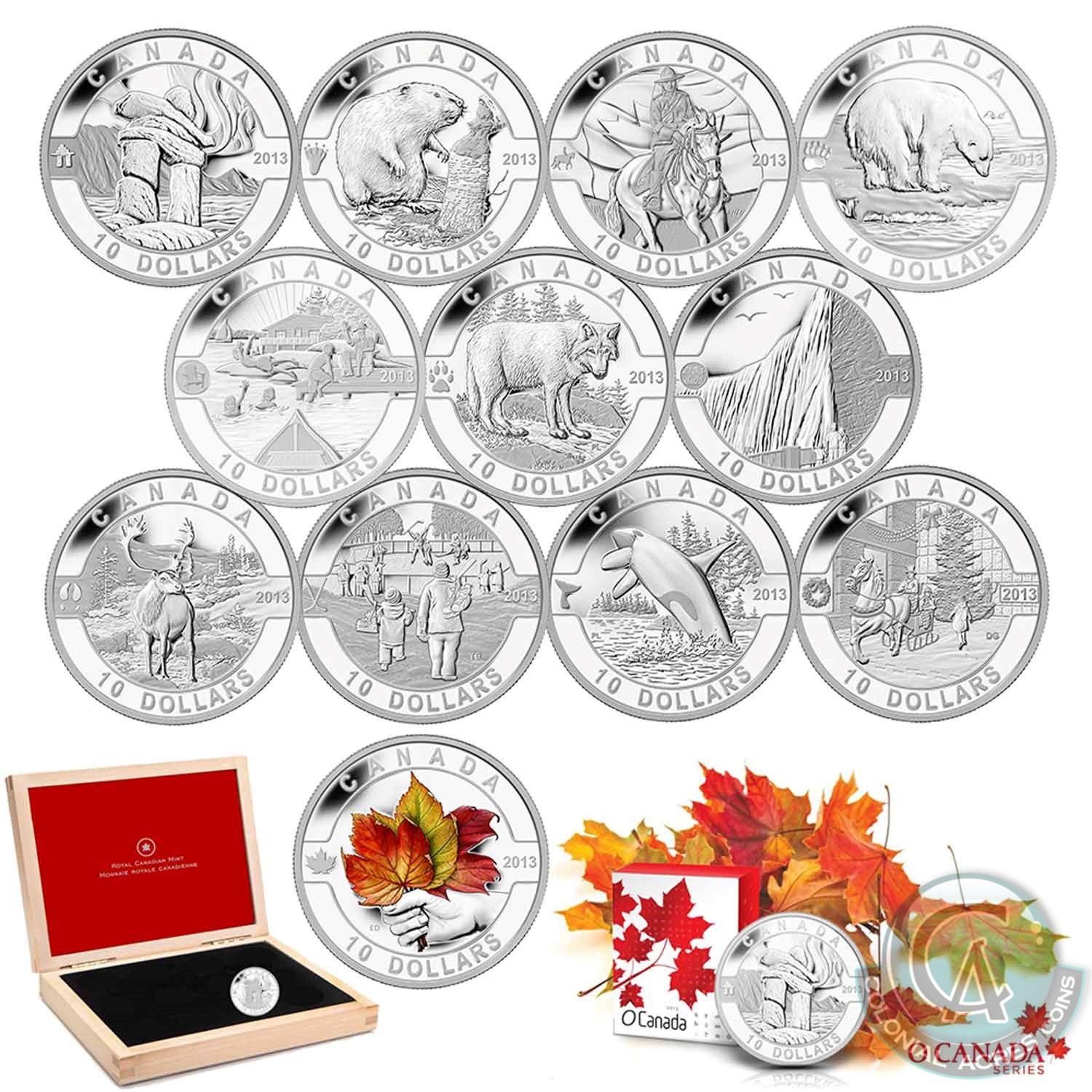 Complete 2013 'O Canada' 12-coin Set with Deluxe RCM Issue Display Case (Tax Exempt). You will receive the Inuksuk, The Beaver, Royal Canadian Mounted Police, The Polar Bear, Summer Fun, The Wolf, Niagara Falls, The Caribou, Hockey, Orca, Maple Leafs, and Holiday Season. 12 coins & Box.