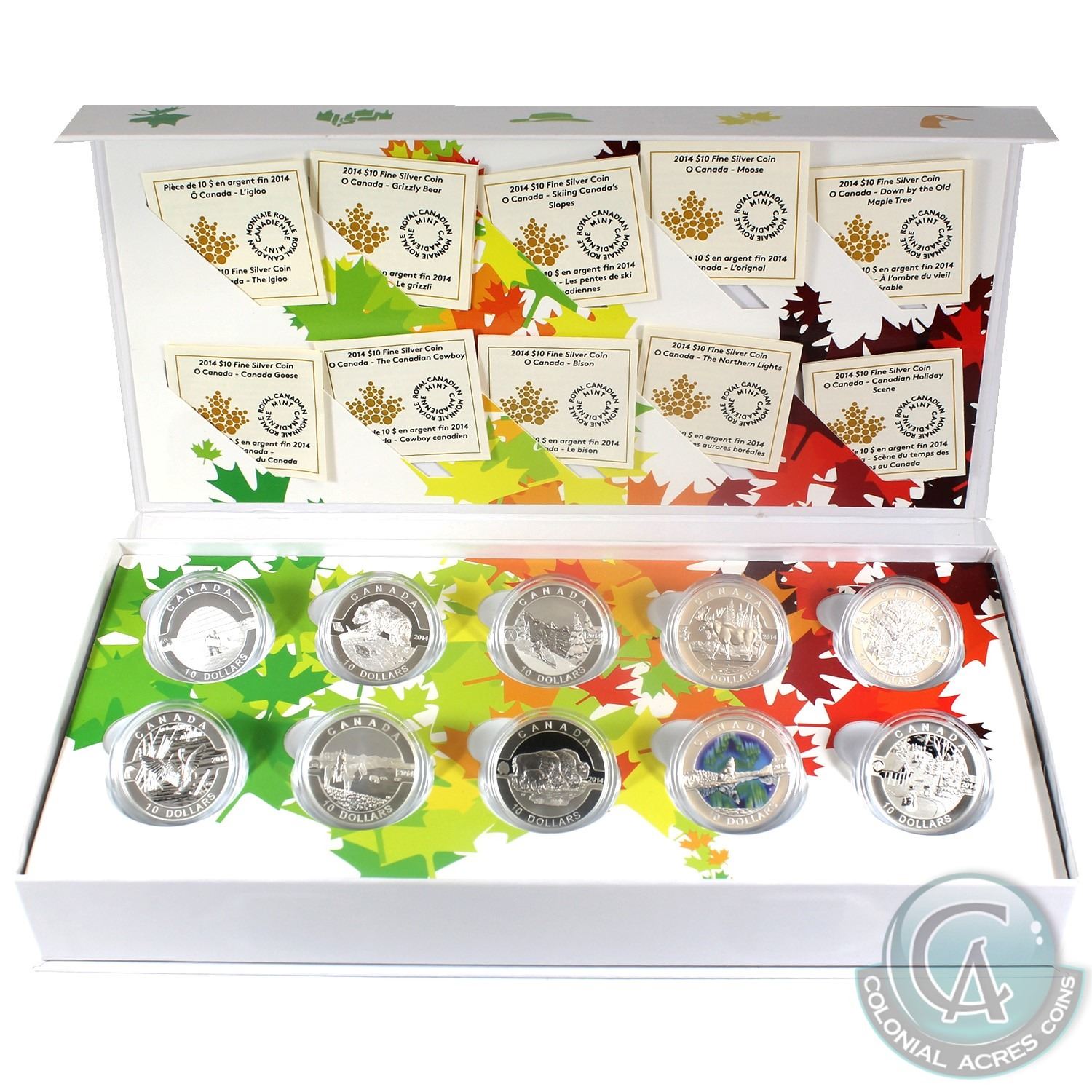 Complete 2014 'O' Canada $10 Fine Silver 10-Coin Set with Deluxe RCM Box (Tax Exempt)