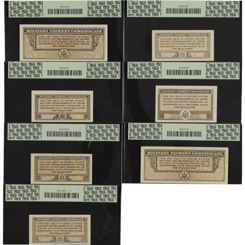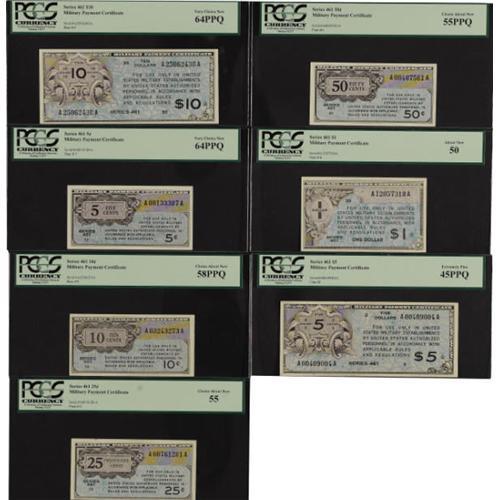 <B>Complete Series 461 Set.</B></I> <B>Series 461 5c PCGS</B></I> <B>64PPQ</B></I>, <B>10c PCGS 58PPQ</B></I>, <B>25c PCGS</B></I> <B>55</B></I>, <B>50c PCGS 55PPQ</B></I>, <B>$1 PCGS 50</B></I>, <B>$5 PCGS 45PPQ</B></I> and <B>$10 PCGS 64PPQ</B></I>. The Ten Dollar is a scarce note this nice. All seven pieces are bright, decently centered and with no flaws visible through the third-party holders. An attractive complete set.<BR><I>From The Thomas M. Flynn Collection</B></I><BR><BR><b>Shipping:</b> Coins & Currency (<a target="_blank" href="http://www.heritageauctions.com/common/shipping.php">view shipping information</a>)