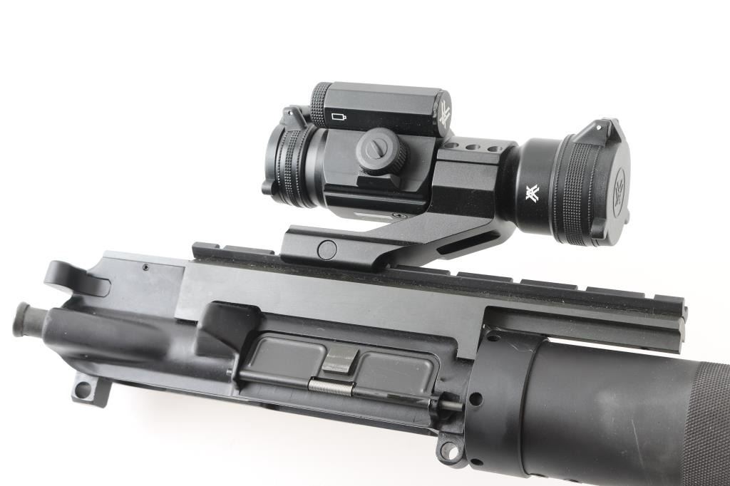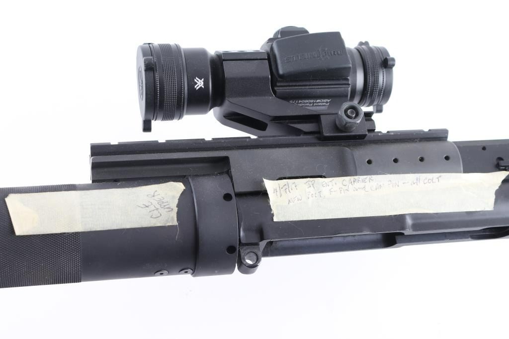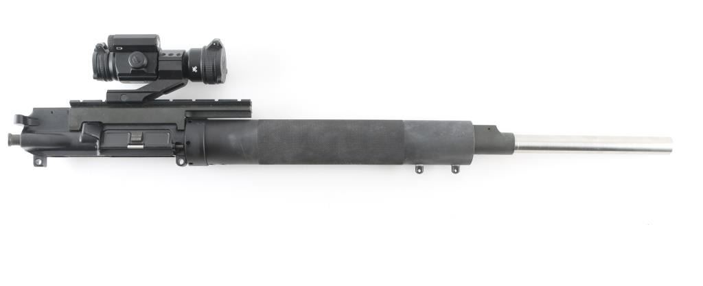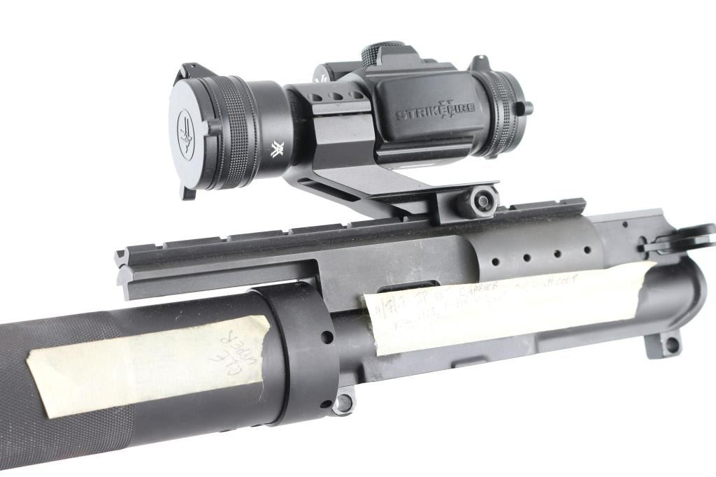 built on a CLE (Compass Lake Engineering) A4 flat top upper with added hi-rise Picatinny Rail. Includes 22" heavy stainless barrel, low profile gas block, knurled finish tube handguard (appears to be from CLE) with two sling studs (or bipod studs), JP Enterprises bolt carrier. Forward assist & ejection port cover installed. Excellent condition Vortex Strikefire dot optic (red or green dot, selectable) has clear view, is mounted using a cantilever mount, attached to the Picatinny rail riser. Includes manual for the optic, a spare bolt (previous owner states both bolts are by Colt). Condition is excellent, with some tape that needs removed & residue cleaned. This upper looks like one of several match uppers sold by Compass Lake.