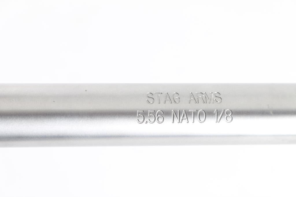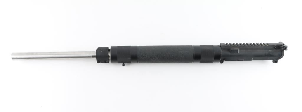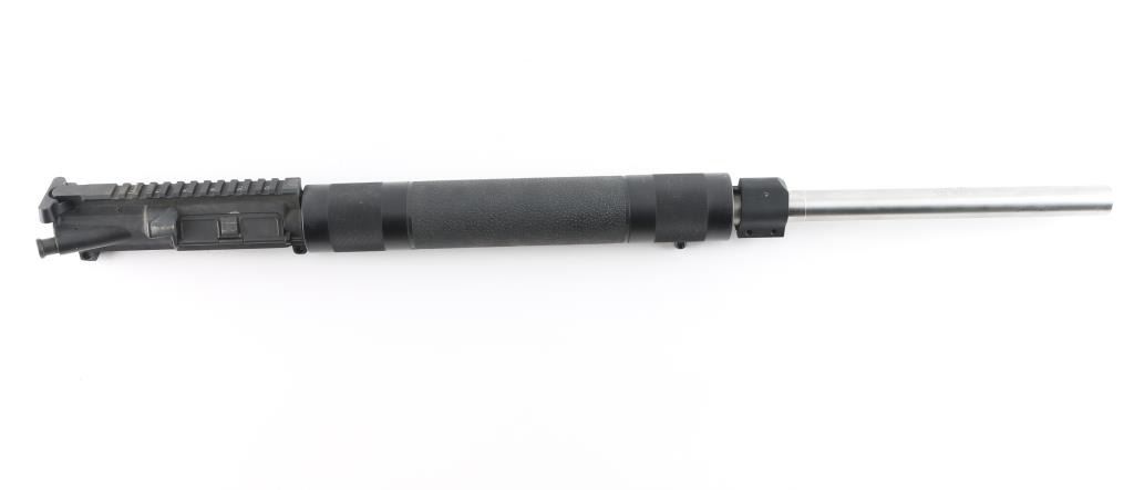 features flat top upper receiver with Picatinny rail, forward assist & ejection port cover. Includes charging handle & bolt carrier group. Barrel is a 24" stainless steel heavy bull, marked "Stag Arms 5.56mm 1/8", with target crown, very good bright bore. Low profile gas block, and 12" free float aluminum handguard with rubber gripping area. Overall excellent condition with handling marks.