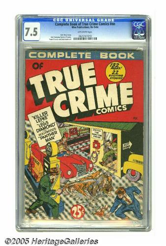 <B>Complete Book of True Crime Comics #nn (Wm. H. Wise & Co., 1945) CGC VF- 7.5 Off-white pages.</B></I> This whopping 132-pager contains re-bound issues of <B>Crime Does Not Pay</B></I>; according to Overstreet, #22 (the scarce first issue of that title) is among them. Artists represented here include Frank Giacoia, Bob Montana, Dick Briefer, and Norman Maurer. Overstreet 2005 VF 8.0 value = $719. CGC census 4/05: 1 in 7.5, none higher.