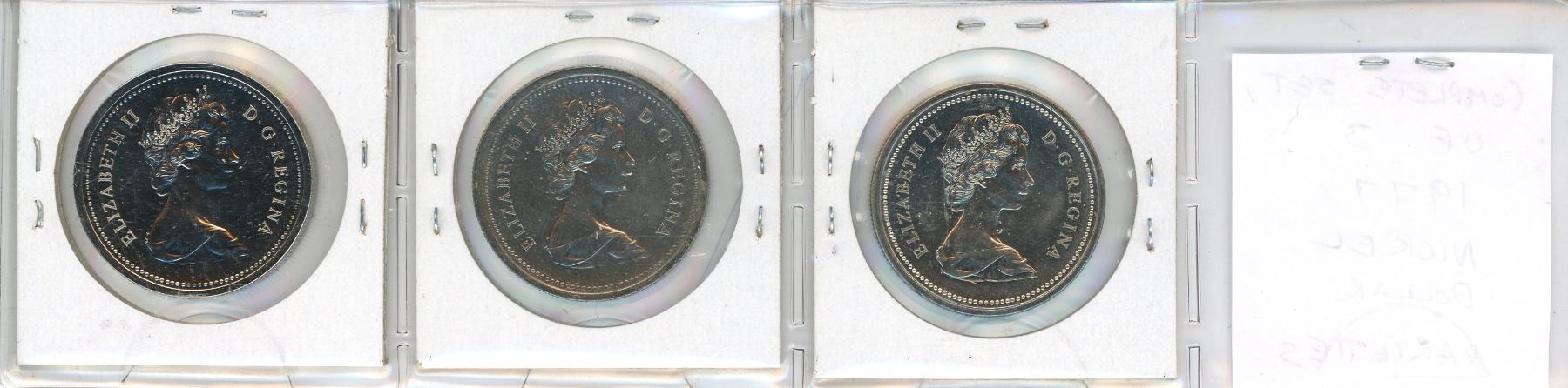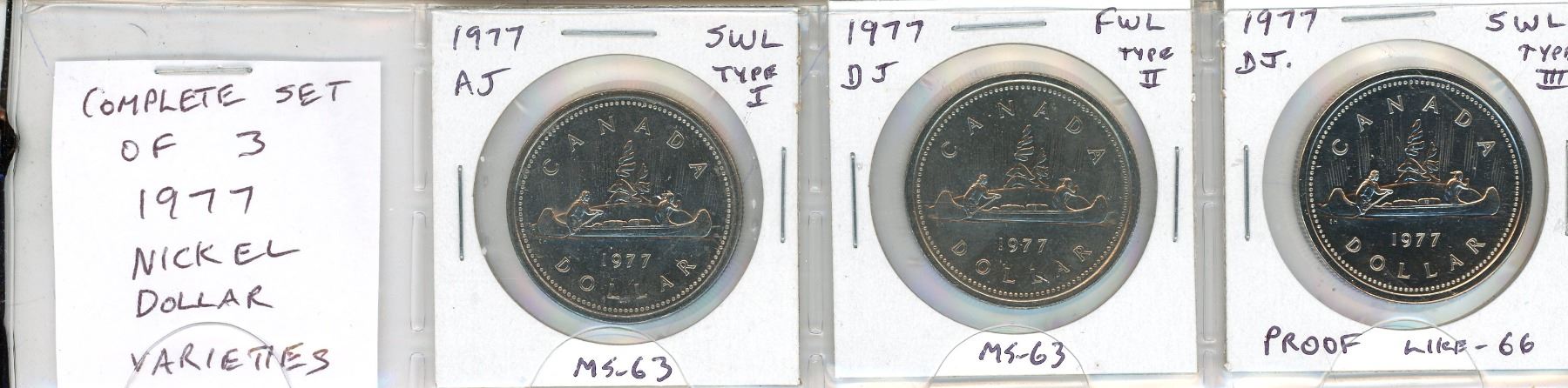 Complete Collection of 1977 Nickel Dollar Varieties. Includes Attached Jewel with Short Water Lines (Type 1); 1977 Detached Jewel with Full Water Lines (Type 2); and 1977 Detached Jewel and Short Water Lines (Type 3). Coins are MS-63 and Proof Like-66.