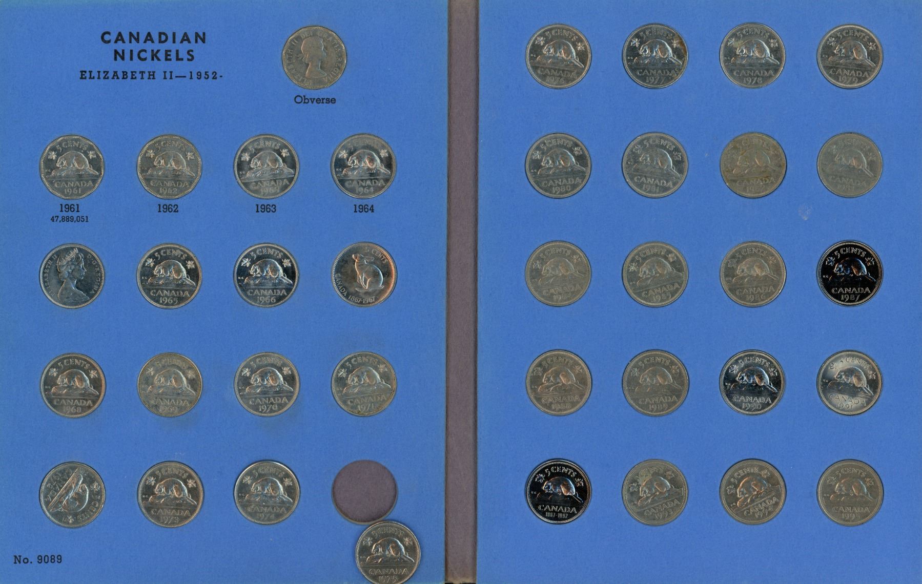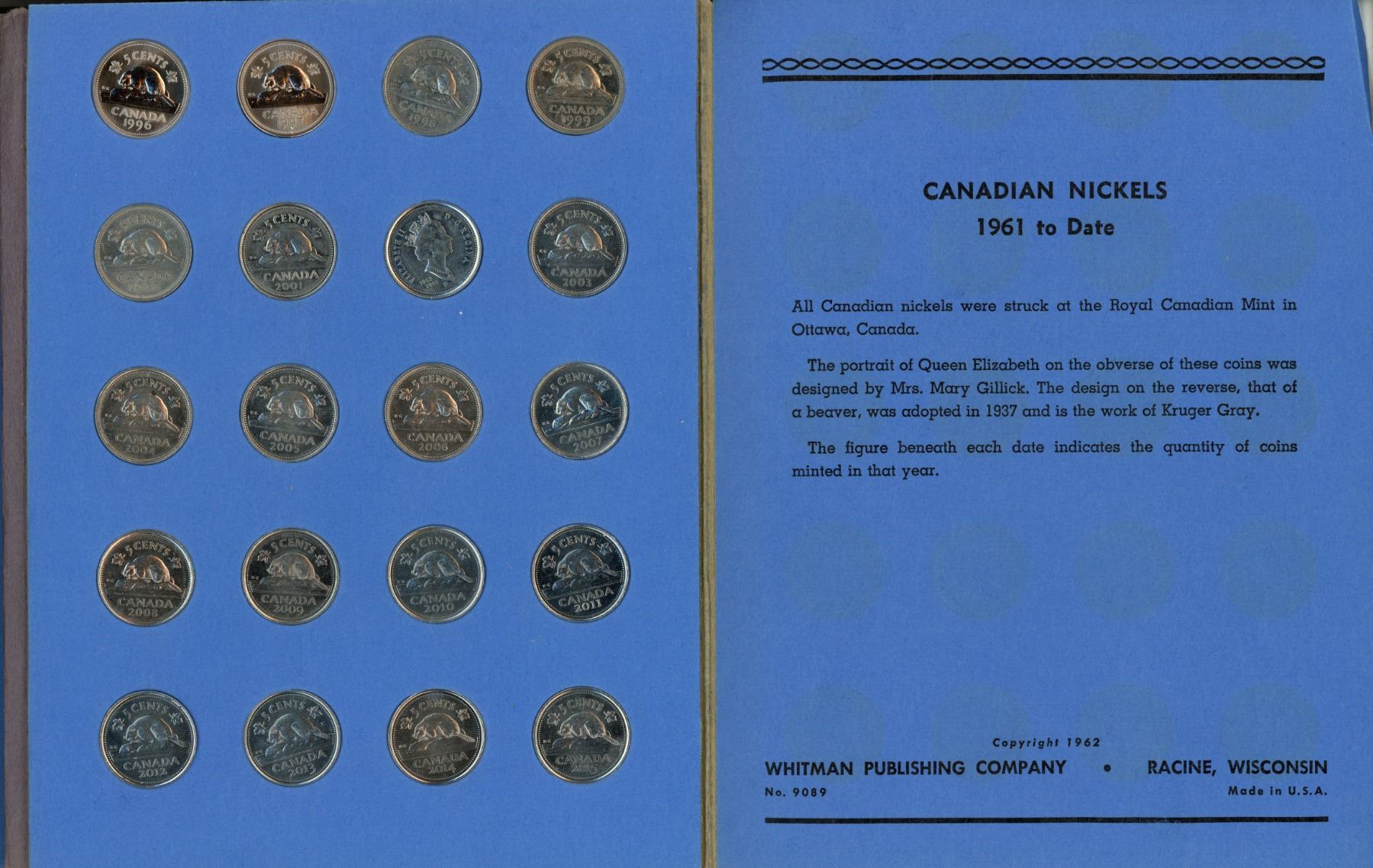 Complete Collection of Canadian Nickels 1961 – 2015. Housed in a blue Whitman folder.