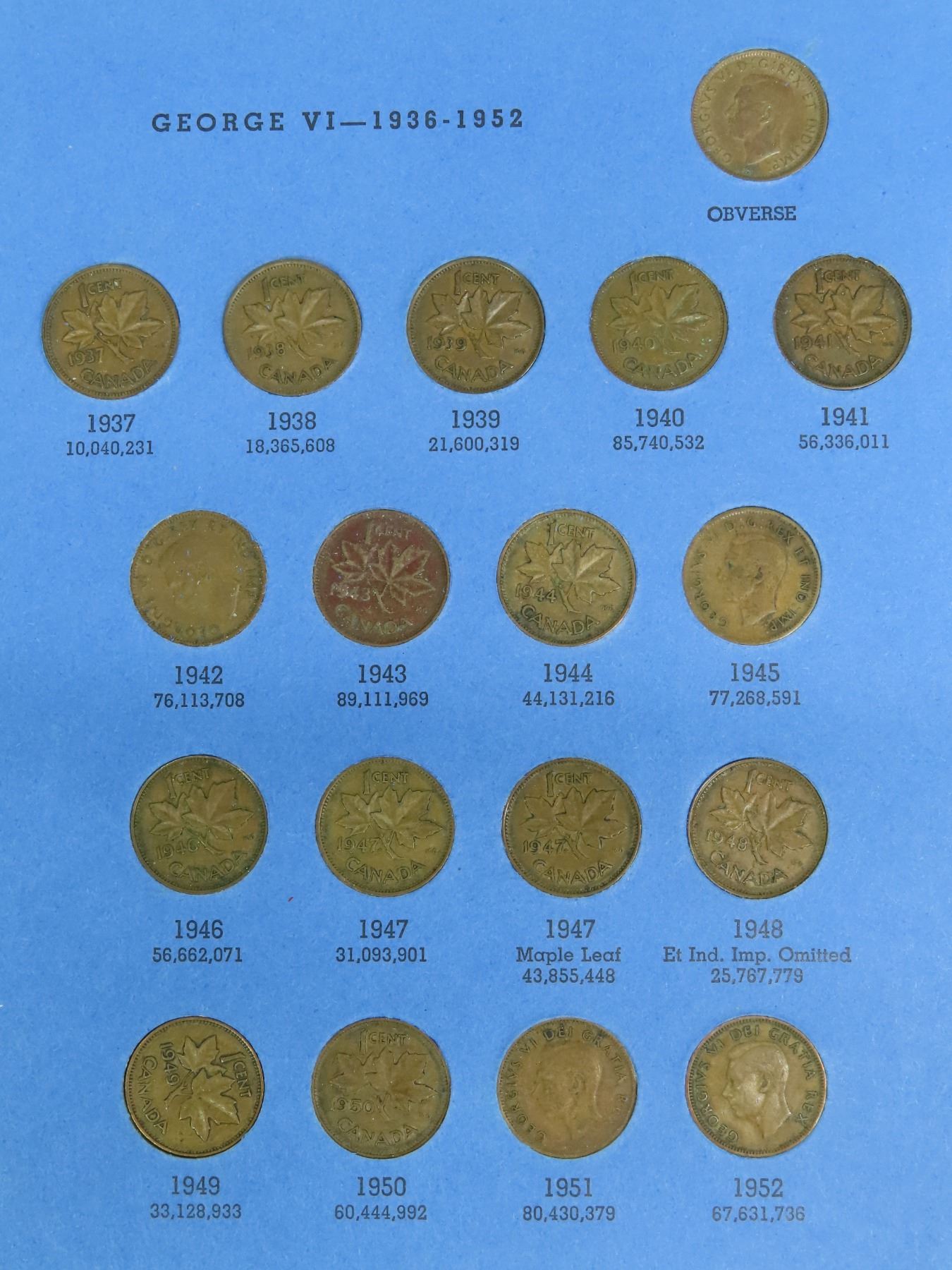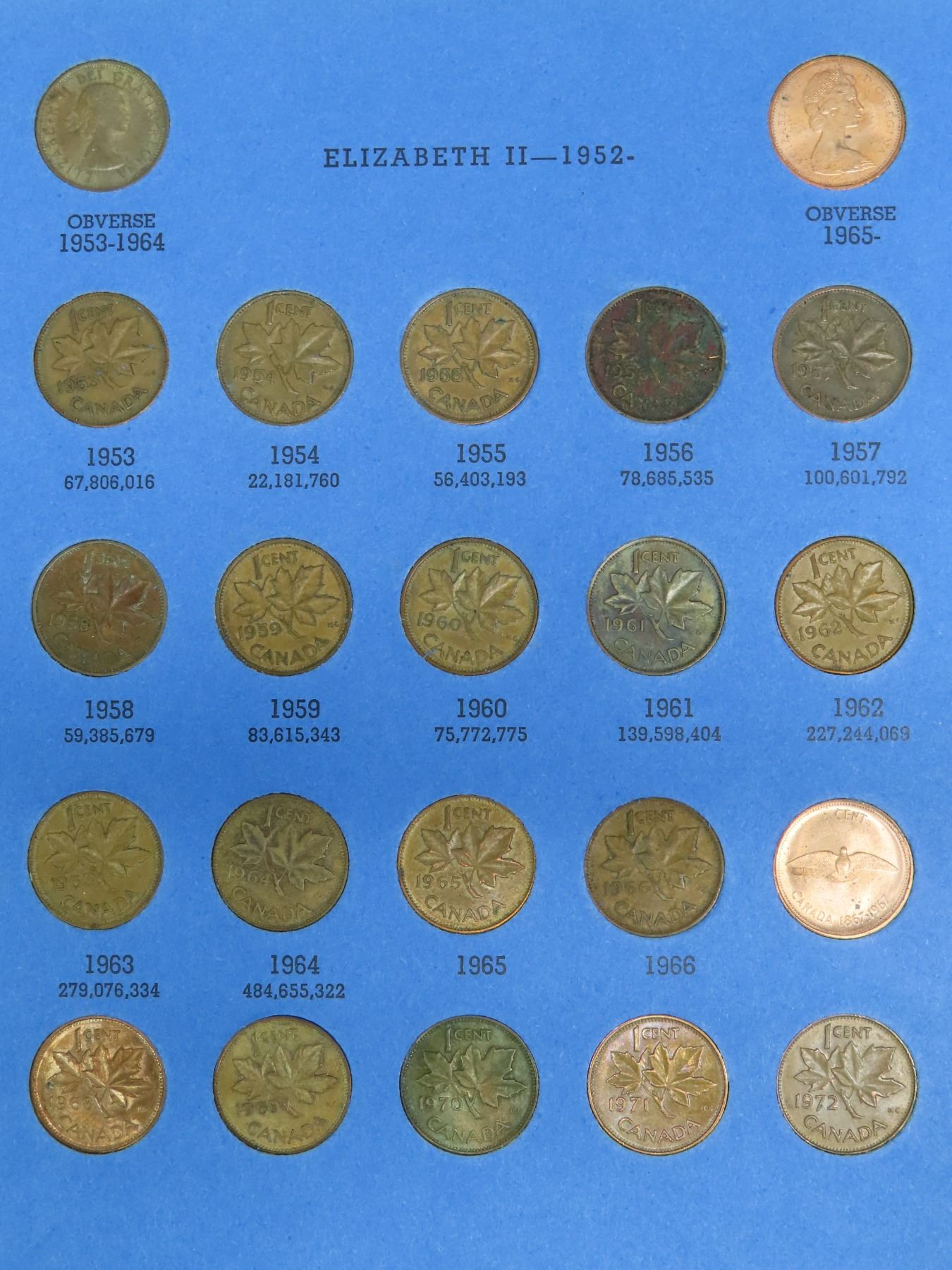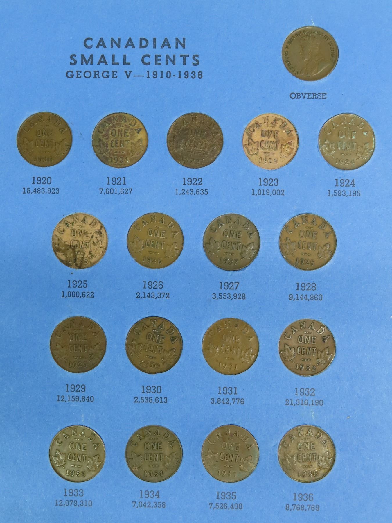 Complete Collection of Canadian Small Cents 1920 to 1972. Includes the Key Dates 1922, 1923, 1924, 1925 & 1926. Housed in a blue Whitman folder.