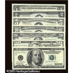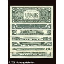 <B>Complete Denomination Radar Set.</B></I><BR>Fr. 1921-B $1 1995 Federal Reserve Note. Gem CU<BR>Fr. 1935-H $2 1976 Federal Reserve Note. Choice CU<BR>Fr. 1981-G $5 1988A Federal Reserve Note. Gem CU<BR>Fr. 2030-B $10 1993 Federal Reserve Note. Gem CU<BR>Fr. 2079-A $20 1993 Federal Reserve Note. Choice CU<BR>Fr. 2126-B $50 1996 Federal Reserve Note. VF-XF<BR>Fr. 2175-B $100 1996 Federal Reserve Note. Gem CU.<BR>This is a difficult set to put together.<BR> 7 notes Lot:15854