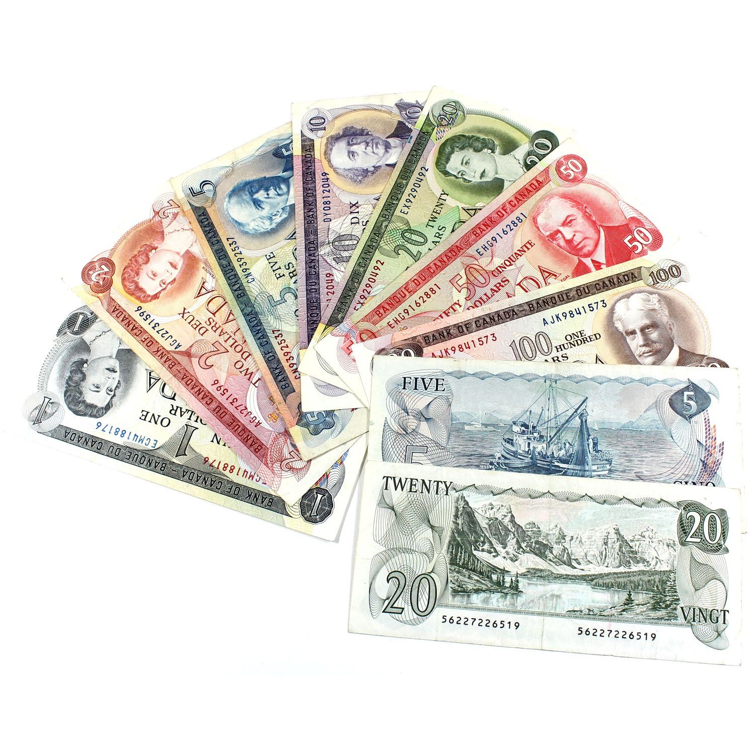 Complete Denominational Type Set of the 1970's Multi-coloured Series. Included are Nine Notes, one of each Denomination available in the Series. 9 pcs