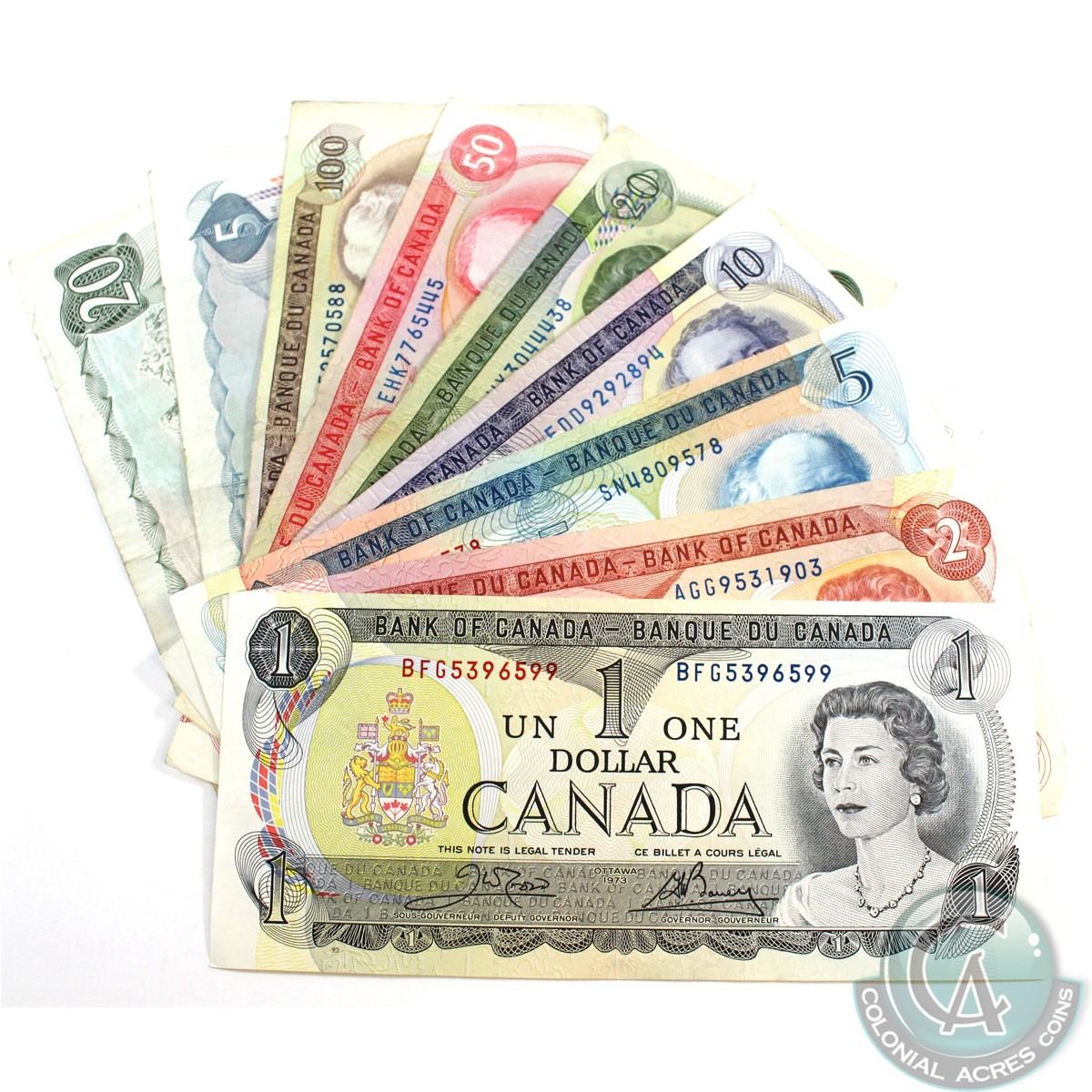 Complete Denominational Type Set of the 1970's multicoloured Banknote Series. Included are Nine Notes from the Series, every Denomination made including both $5s and both $20s. 9 pcs.