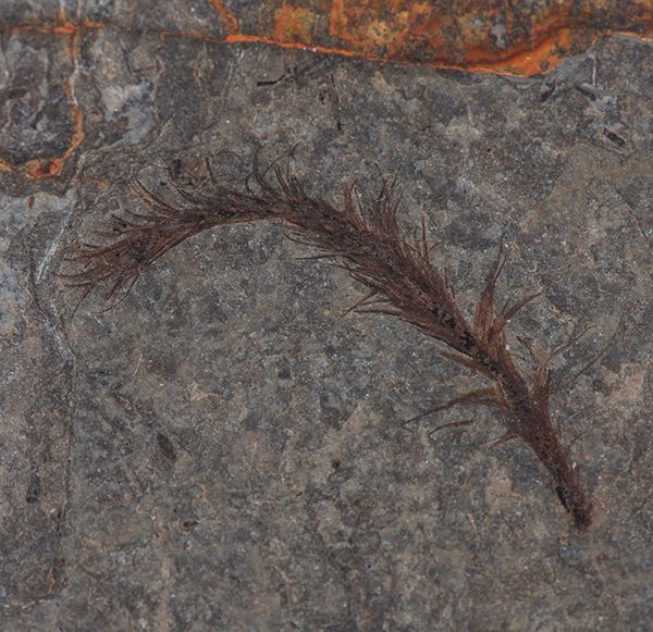 Complete Dinosaur Feather. At 125-135 million years old this large 1.5 inch dinosaur feather is one of the oldest feathers known exceeded in age only by the 150 million year old Archaeopterix bird feather from Solnhofen. This long feather is symmetric which means that it is not a flight feather such as those found on birds. The center rachis is thin and highly flexible as the feather is gently curved to the left but the entire feather is still covered with many filaments with remarkable detail showing delicate veining of the individual barbs. Even though this fossil feather is dark brown, that is from the mineralization of the fossilization process. The actual color of the fossil was probably much different and remarkably can now be determined analyzing the shape of melanosomes (pigment cells) by electron microscope. Comparing similar shaped melanosaomes in modern birds and what colors they created, the color of the dinosaur feathers can be obtained.